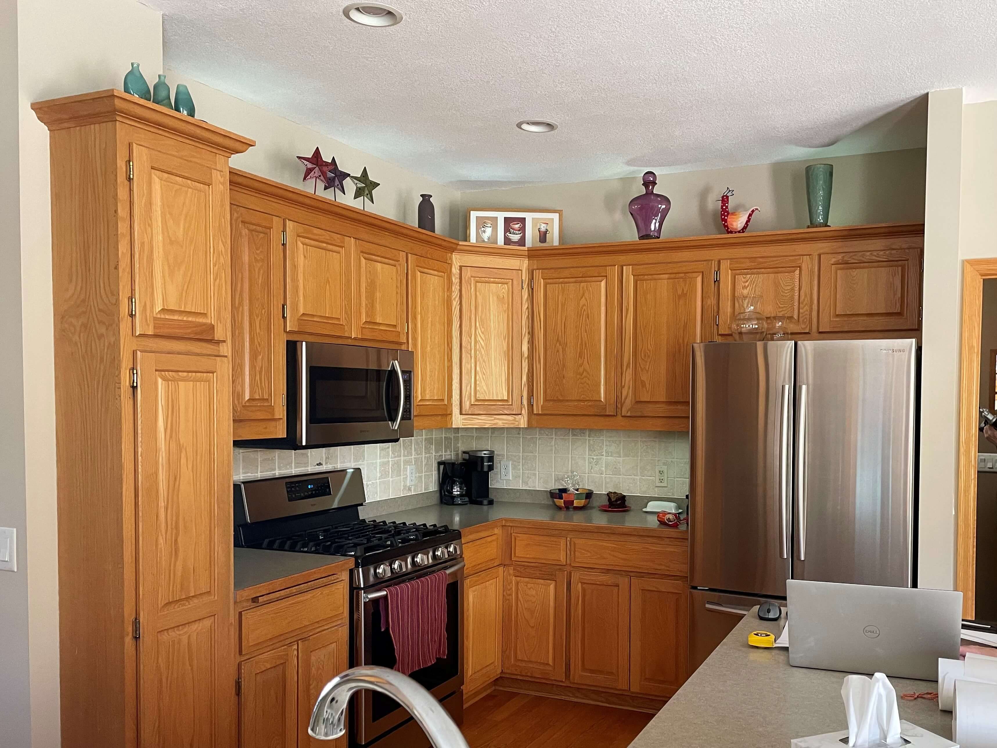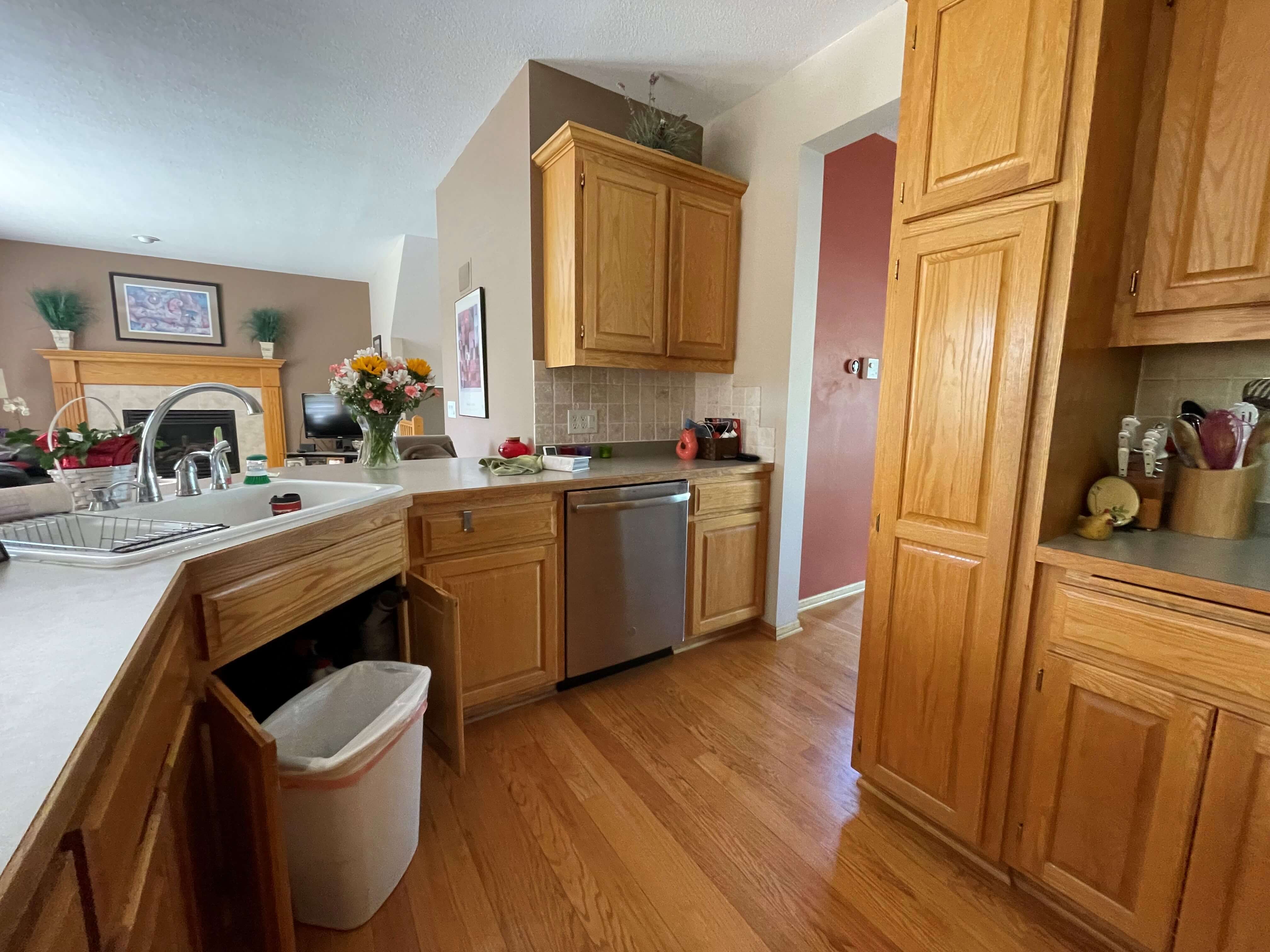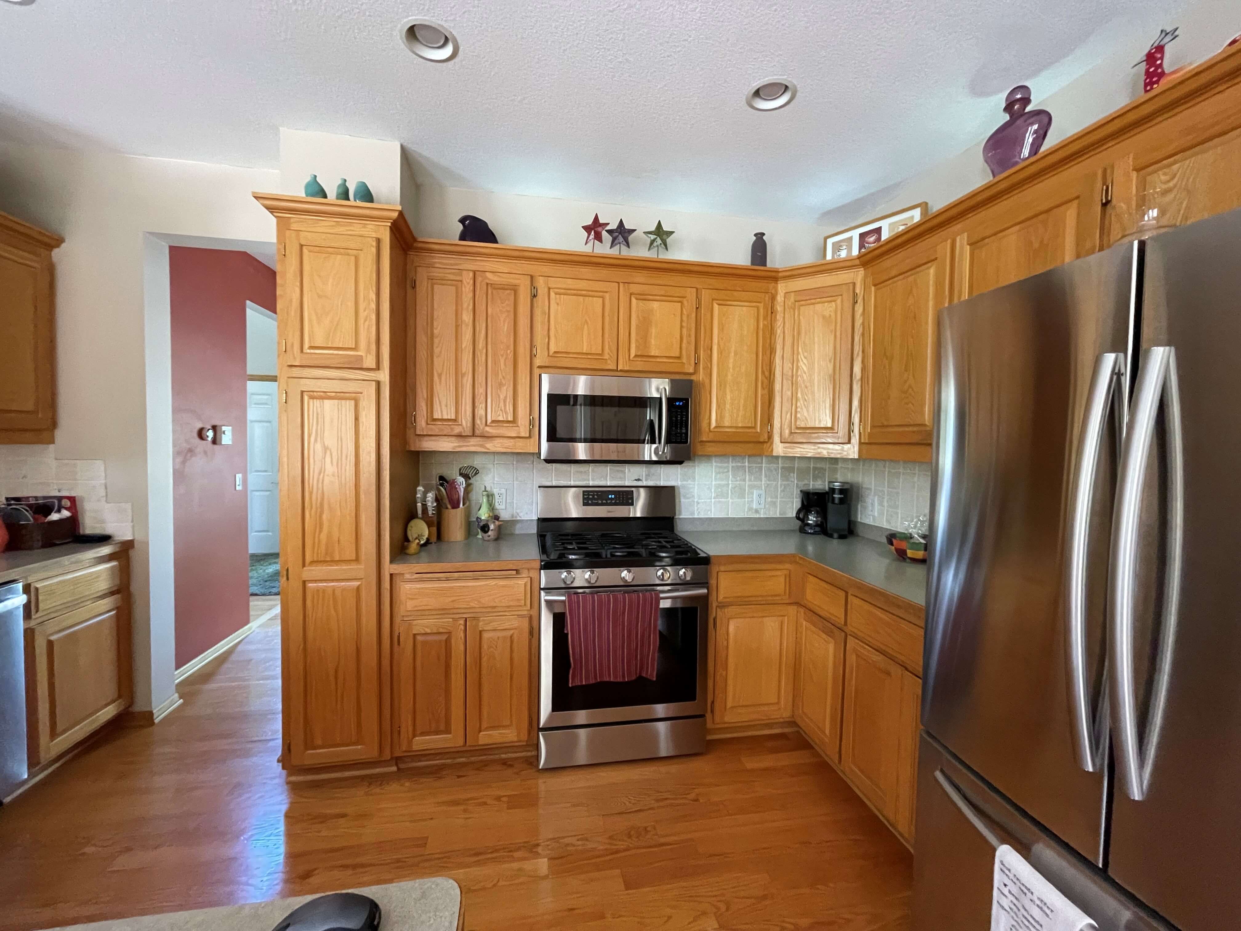 LeAnn and Patrick Oberstar built their 2 story home back in 1999 in a developing neighborhood of Inver Grove Heights, Minnesota. The interior finishes reflected what was popular during that time, with oak wood flooring, trim, and cabinets in a honey finish being prevalent throughout the home. It was a busy home back in the day, with their daughter and son hanging out with a lot of the neighborhood kids there. Now that the kids are grown, it’s a bit quieter, and LeAnn and Patrick began thinking of the next phase of their life. They looked at the re-sale condition of their home and thought it was time to update the kitchen to not only enjoy while they could, but to entice potential home buyers if and when they do decide to sell after retirement.