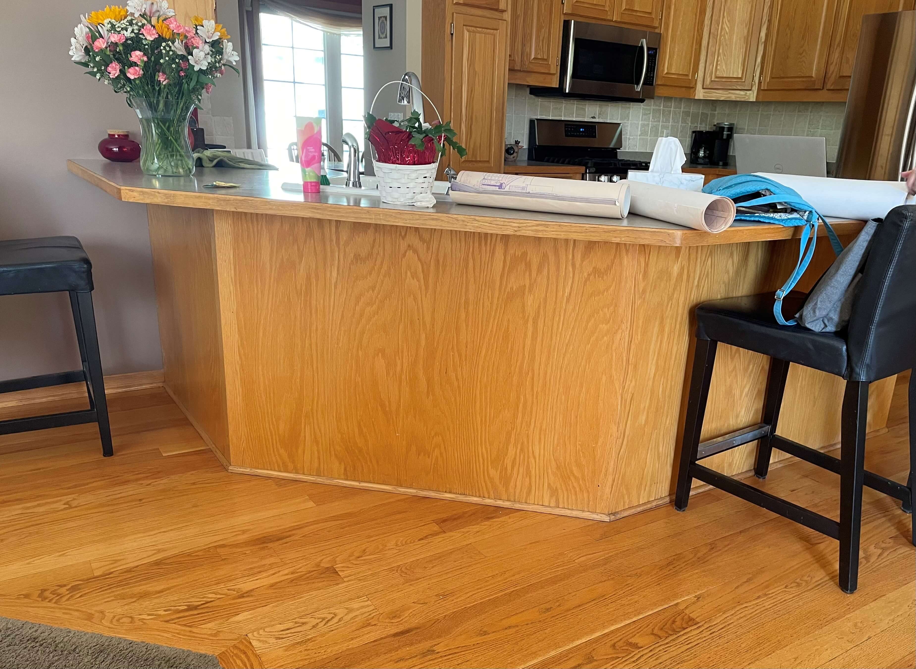 The original oak cabinets were custom built and stopped about 15″ from the ceiling and finished off with a crown molding. The drawers were wood boxes mounted on side mount glides and the door hinges were an exposed overlay type. The countertops were laminate with a wood bevel edge in oak to compliment the cabinets. Even the flooring throughout was a honey stained oak. They all stood the test of time, but lacked what many newer kitchens have today as far as looks and conveniences.
