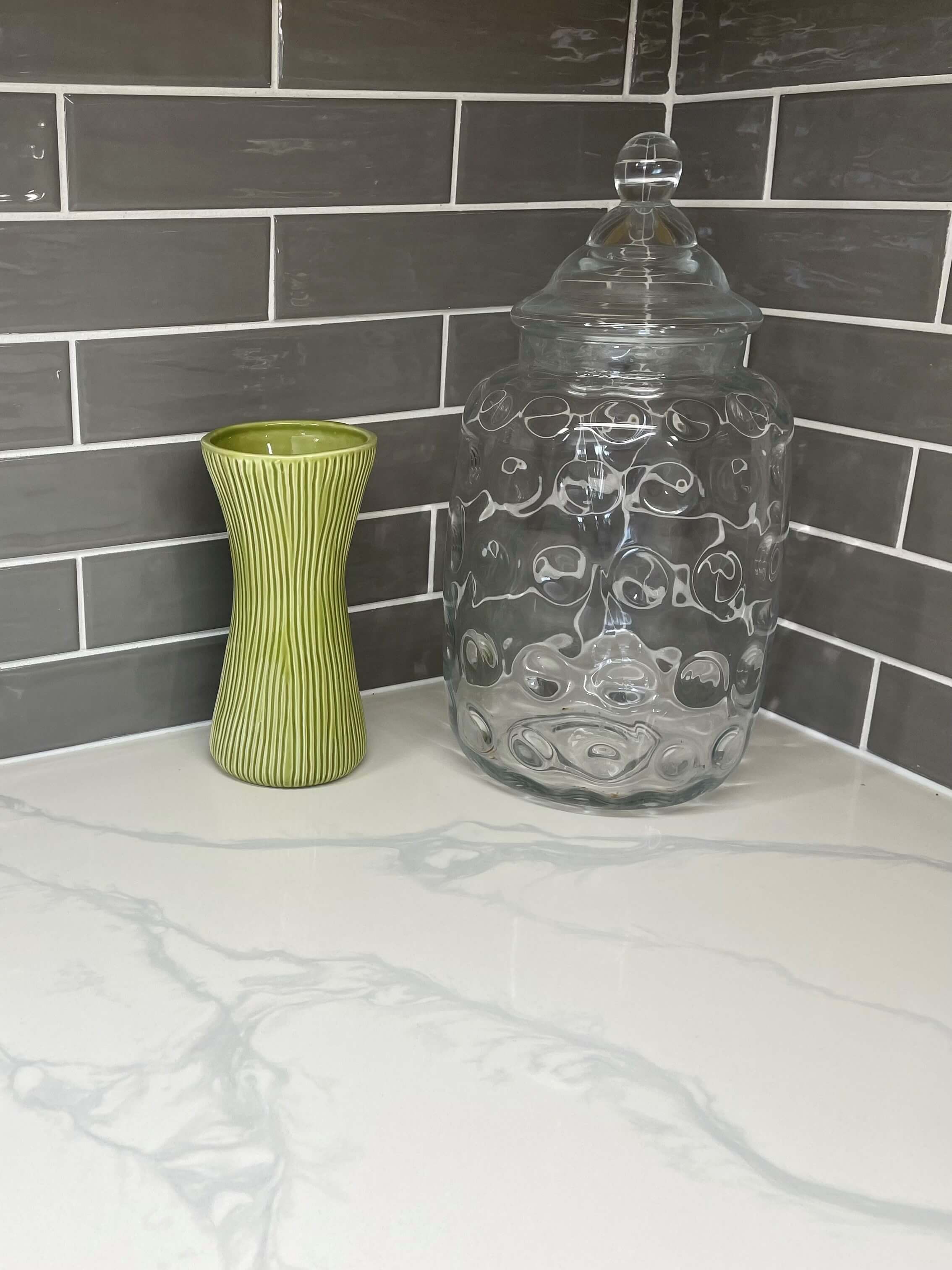 Textured grey tiles for the backsplash compliment the quartz countertops
