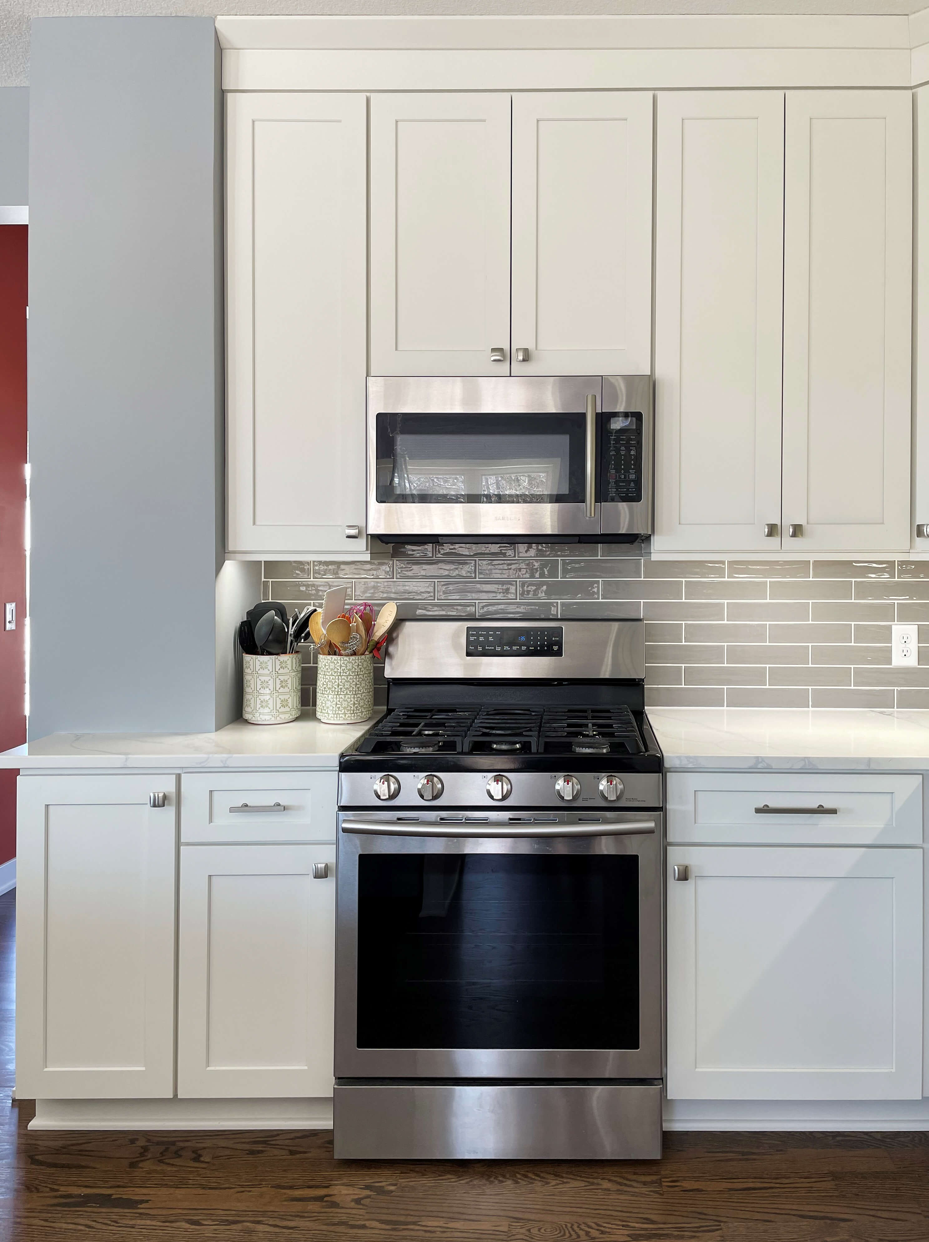 The tall shallow pantry that used to be to the left of the range was removed and never replaced, opening up the kitchen more, especially when you enter from the dining room on the other side of the wall. Tray dividers were added to the base cabinet just left of the range for functional storage. Fun note: they haven’t even filled the cabinet above the microwave yet due to all the new storage!