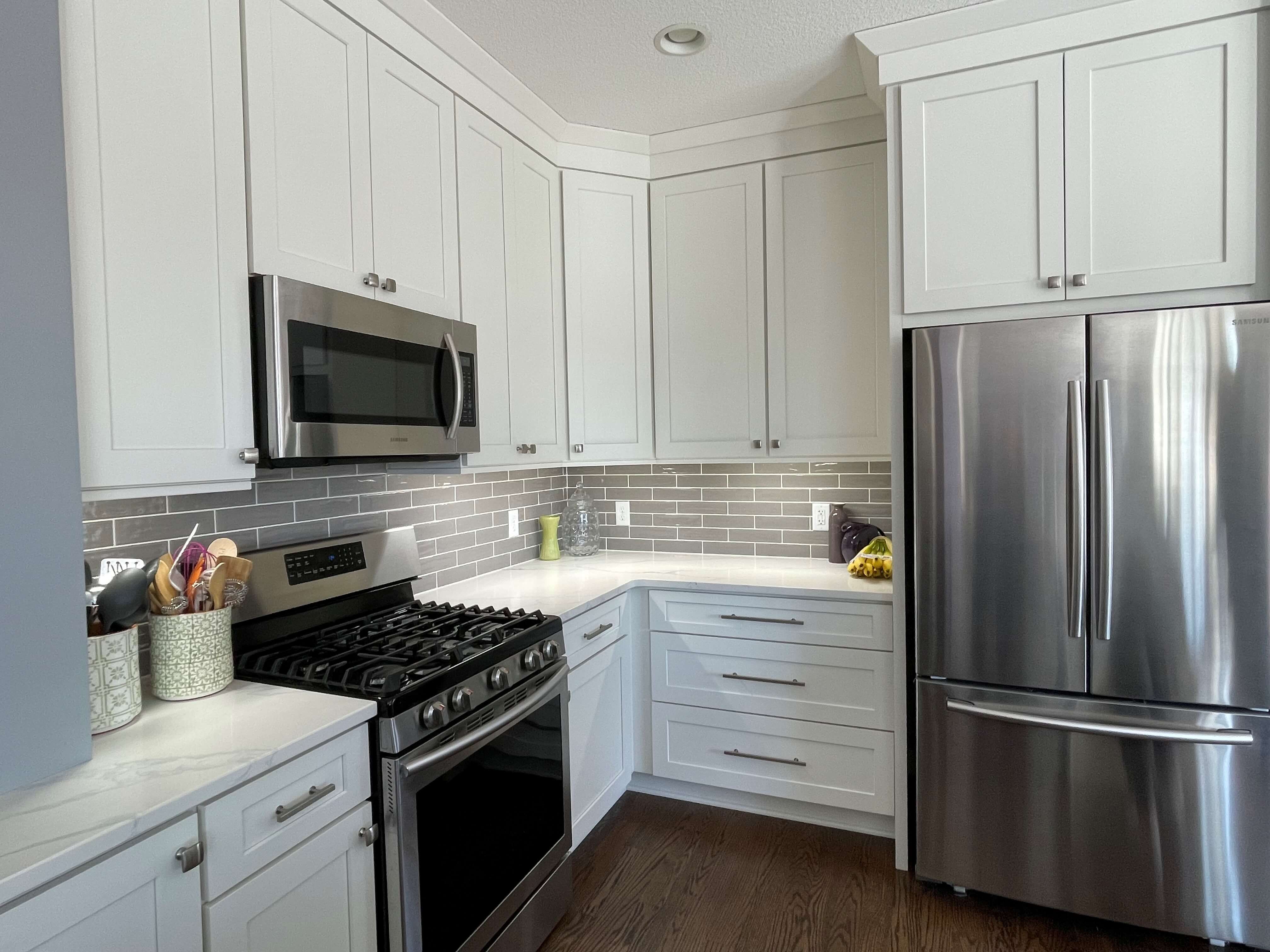 While white kitchens are still trending for kitchen cabinets, they are transitioning to a more natural white, with softer tones that are easier on the eyes. Leann loved the look of Dove White, and it was going to work really well with the new stain they had chosen for their oak wood floors that would be stripped and refinished. They were going to be a darker, true brown color which is another trend when it comes to stains.