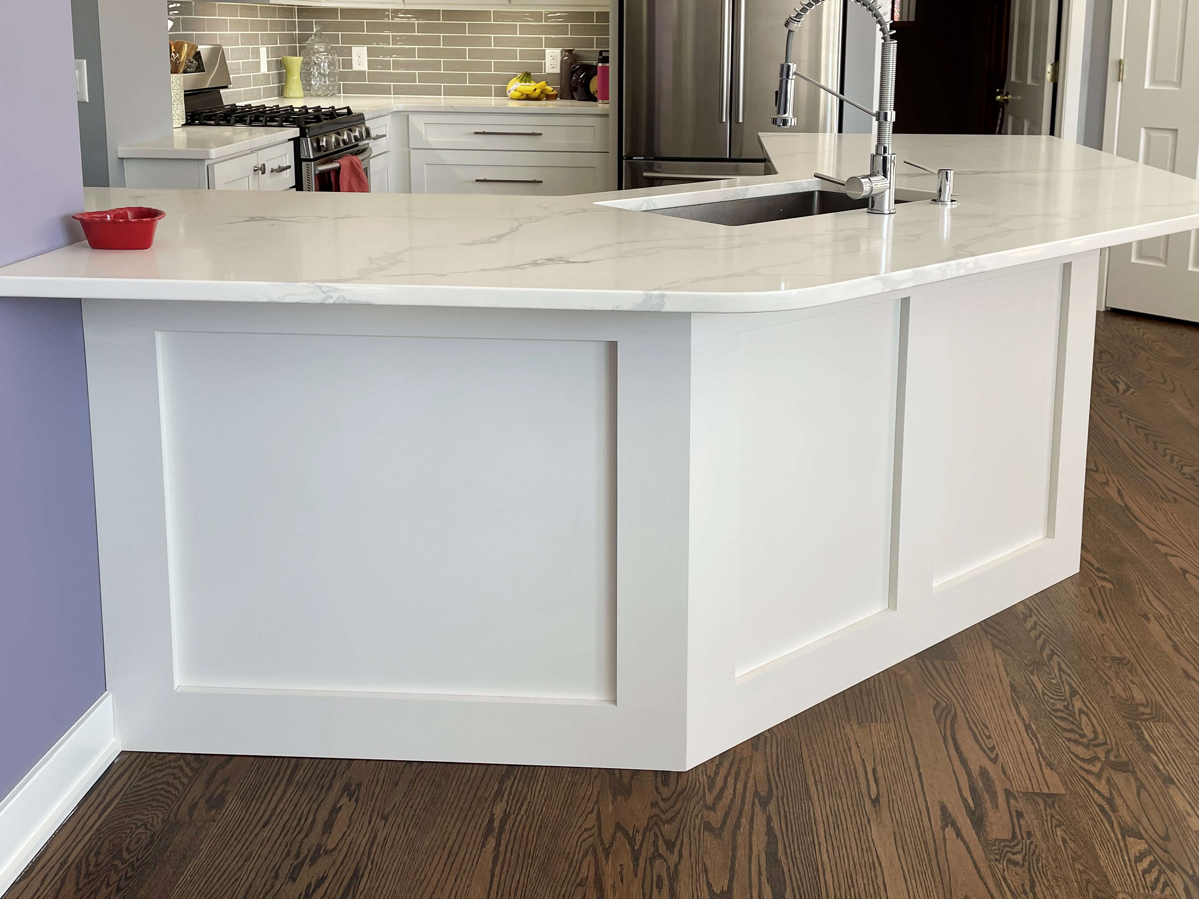 To help keep costs down for the remodel Patrick did all the install work himself. With the exception of the countertops and the refinishing of the floors, he was confident he could handle the task at hand. After all, he is an engineer, and if he could build his very own car from the ground up – a Shelby Cobra – he could probably install a few cabinets and trim. There were some challenges to overcome, like working around the plumbing in the angled peninsula, but his meticulous attention to detail paid off. Their kitchen looks fantastic! Even the wainscot detail on the back of the peninsula was created with finished panels and solid stock that he trimmed and assembled on site.