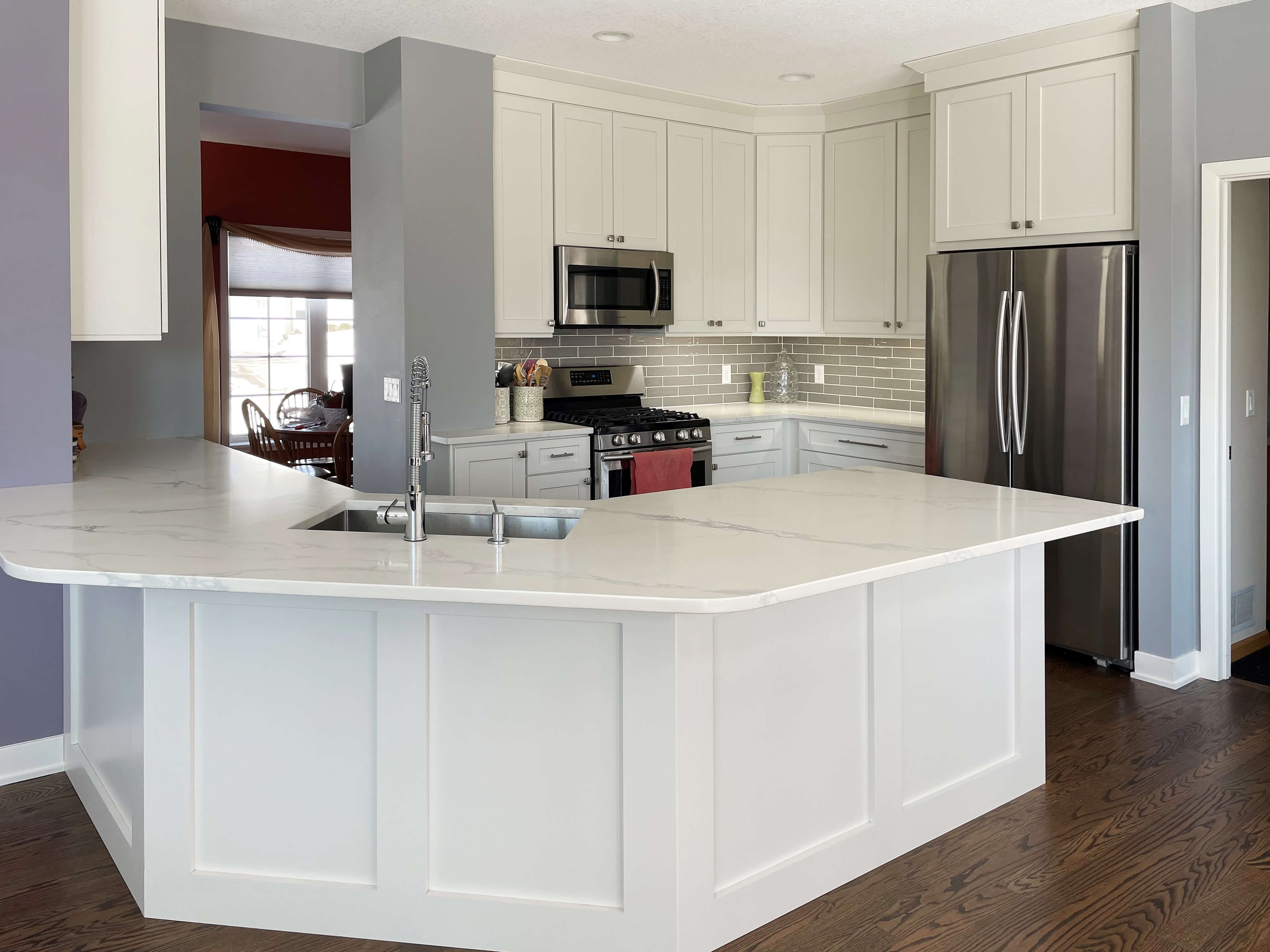 LeAnn knew she wanted quartz countertops and found a beautiful marble-like one that matched well with the finish of the cabinets. She found a textured glass tile in grey for the backsplash and it pulled everything all together. The faucet and deep sink were recommended to them by her brother, and they both work well with the design as well as for their entertaining needs.