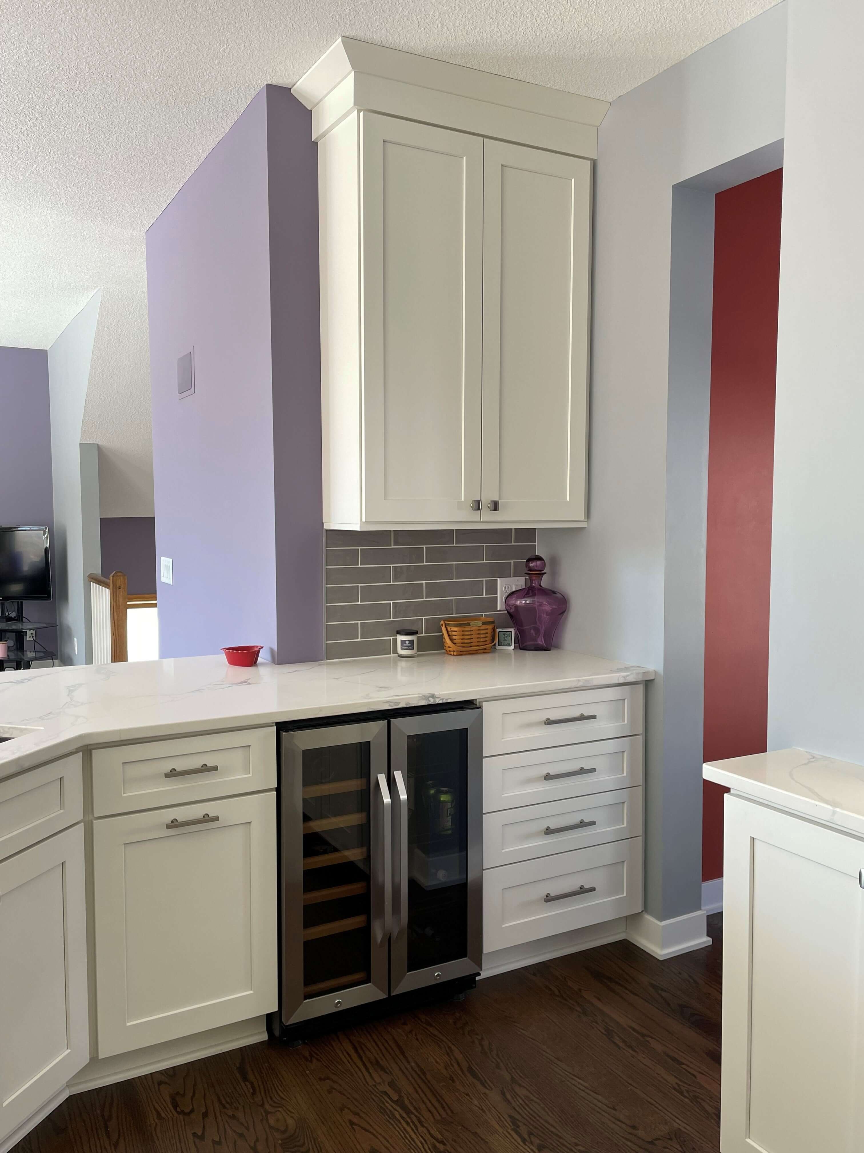 The Oberstars wanted to have a beverage fridge for entertaining, so creating a space for the appliance near the dining room was important. The dual unit is great for chilling their favorite wines as well as other casual beverages for guests to help themselves to. The pull-out recycling center is right of the angled sink for easy clean-up, and the 4 drawer base was another bonus for them.