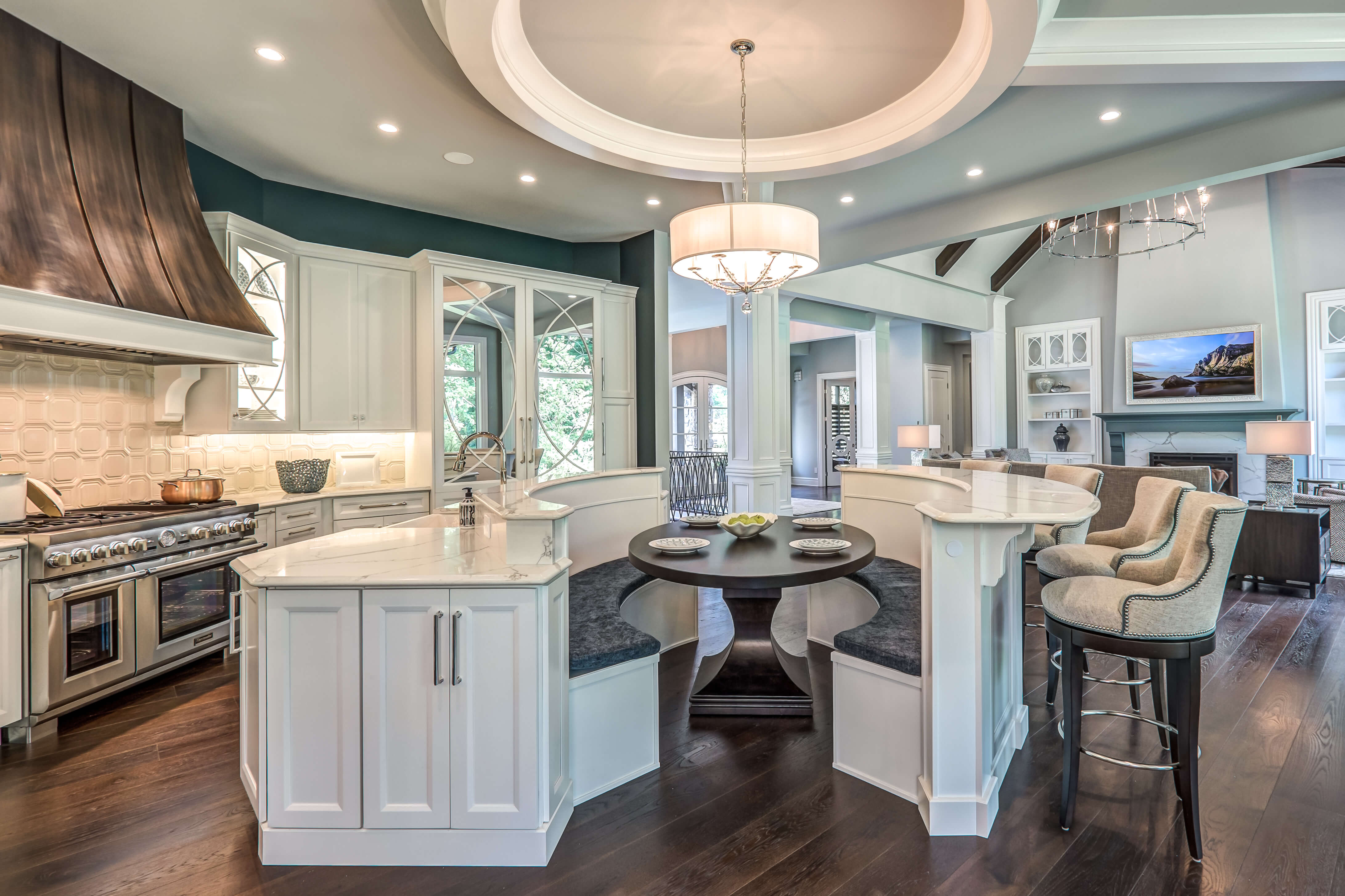 This kitchen has so much WOW going on! A beautiful center banquette adds coziness to the room with access from both sides. The additional bar seating makes this room a great space for entertaining.