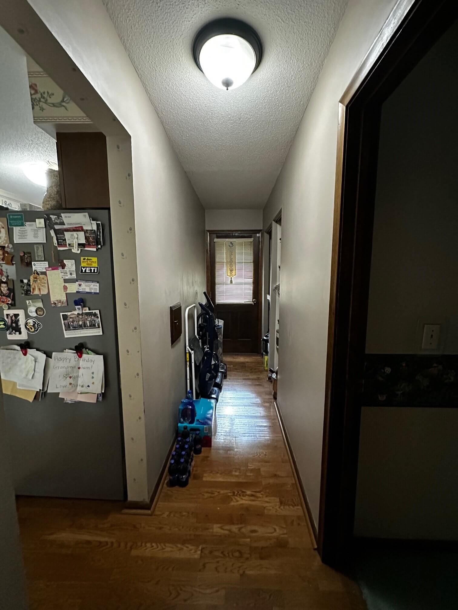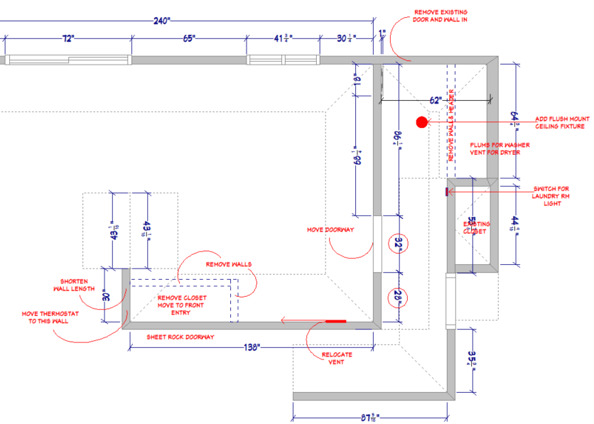 After working on a couple of designs with the wall removed, and not liking how the space was flowing, I had an ‘ah-ha!’ moment; instead of removing the wall, why not keep it and make the back hall space a laundry room? Not only would it cut the cost of removing the wall, but it would allow the bedroom office to continue to be just that. This also made the new kitchen space flow better from the bedrooms, and with the front closet removed, there was a lot to work with.