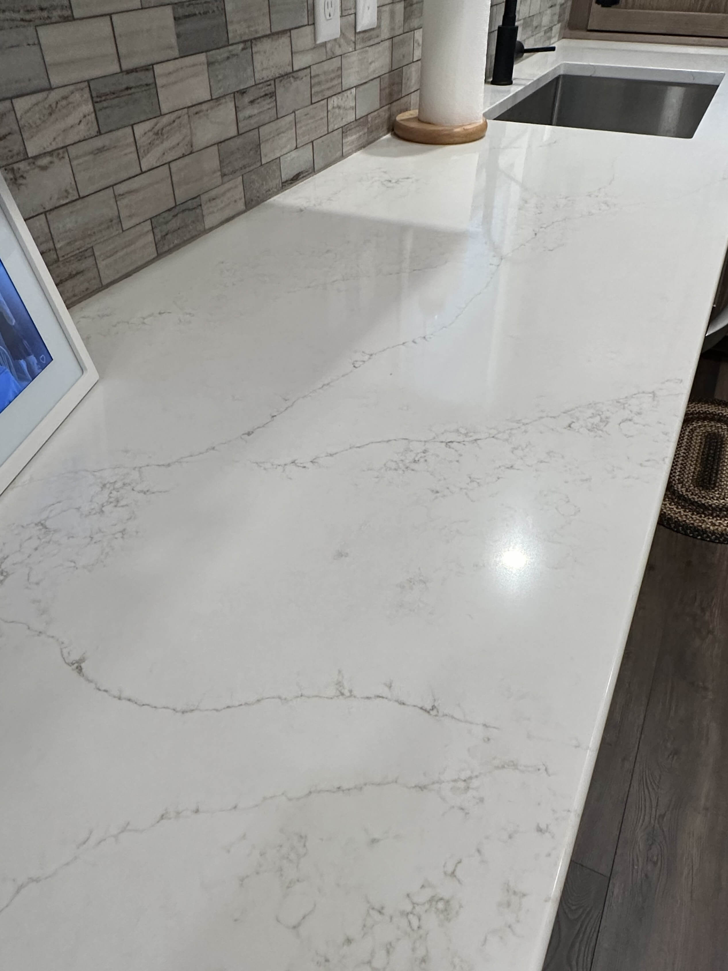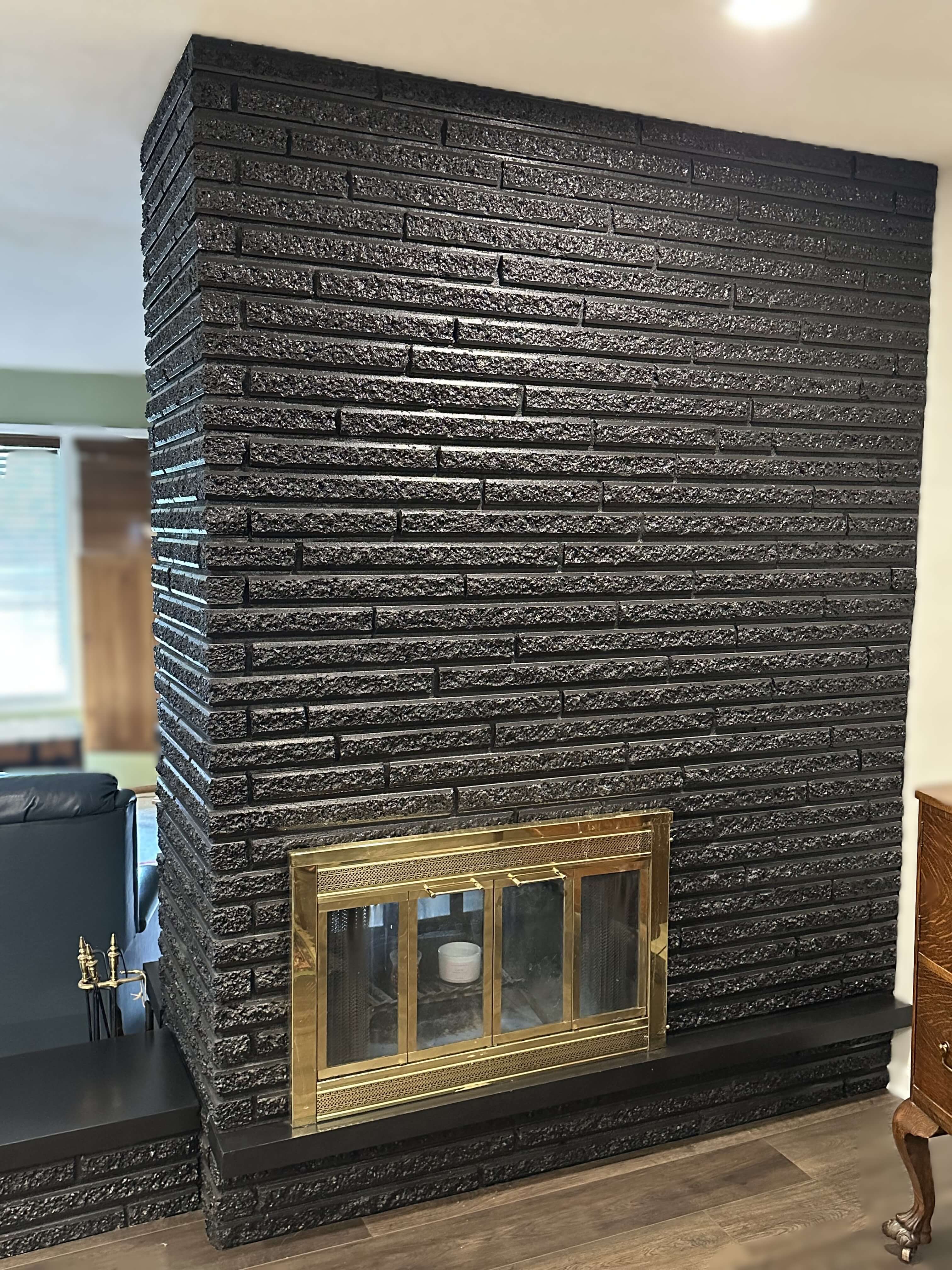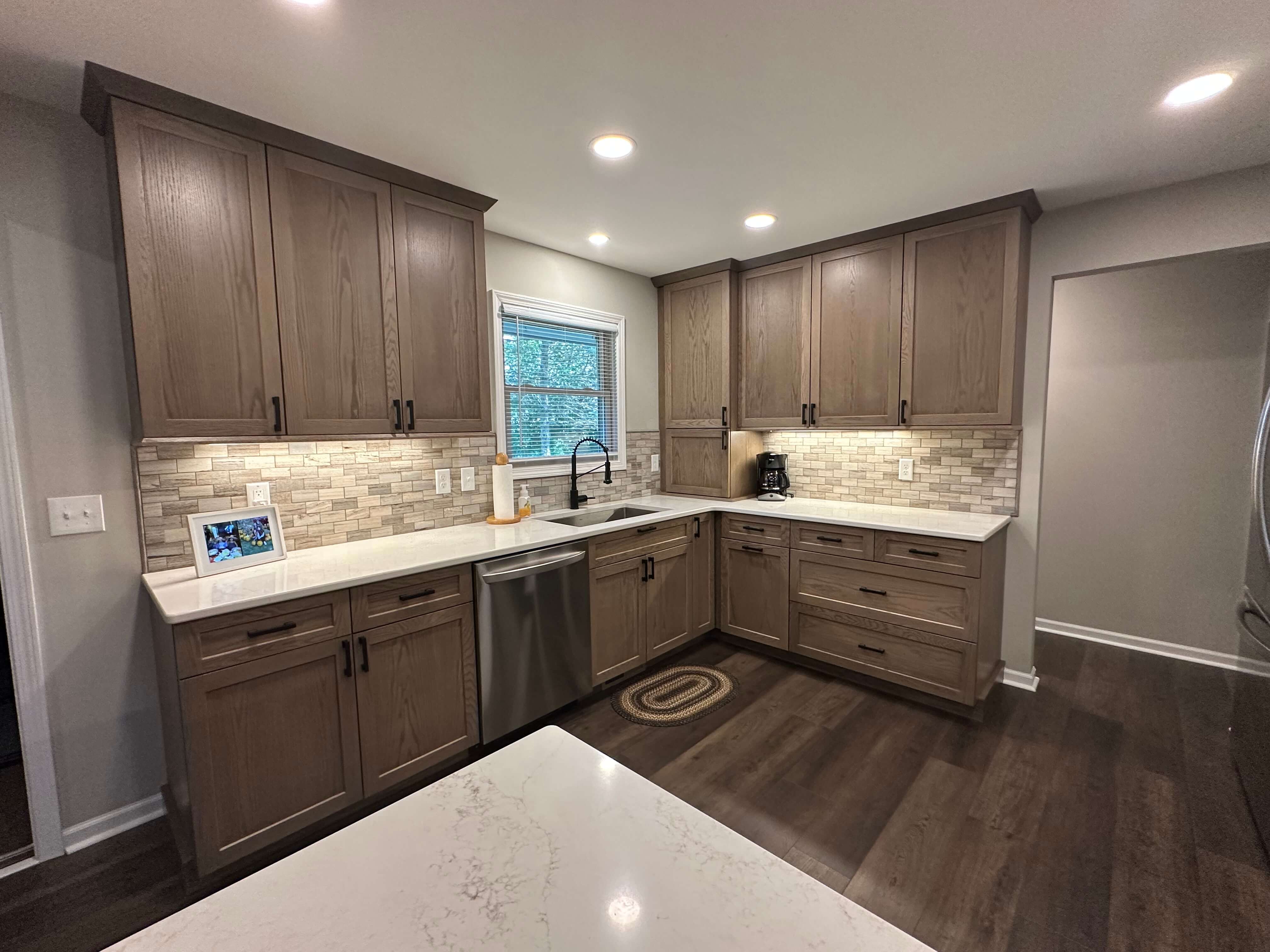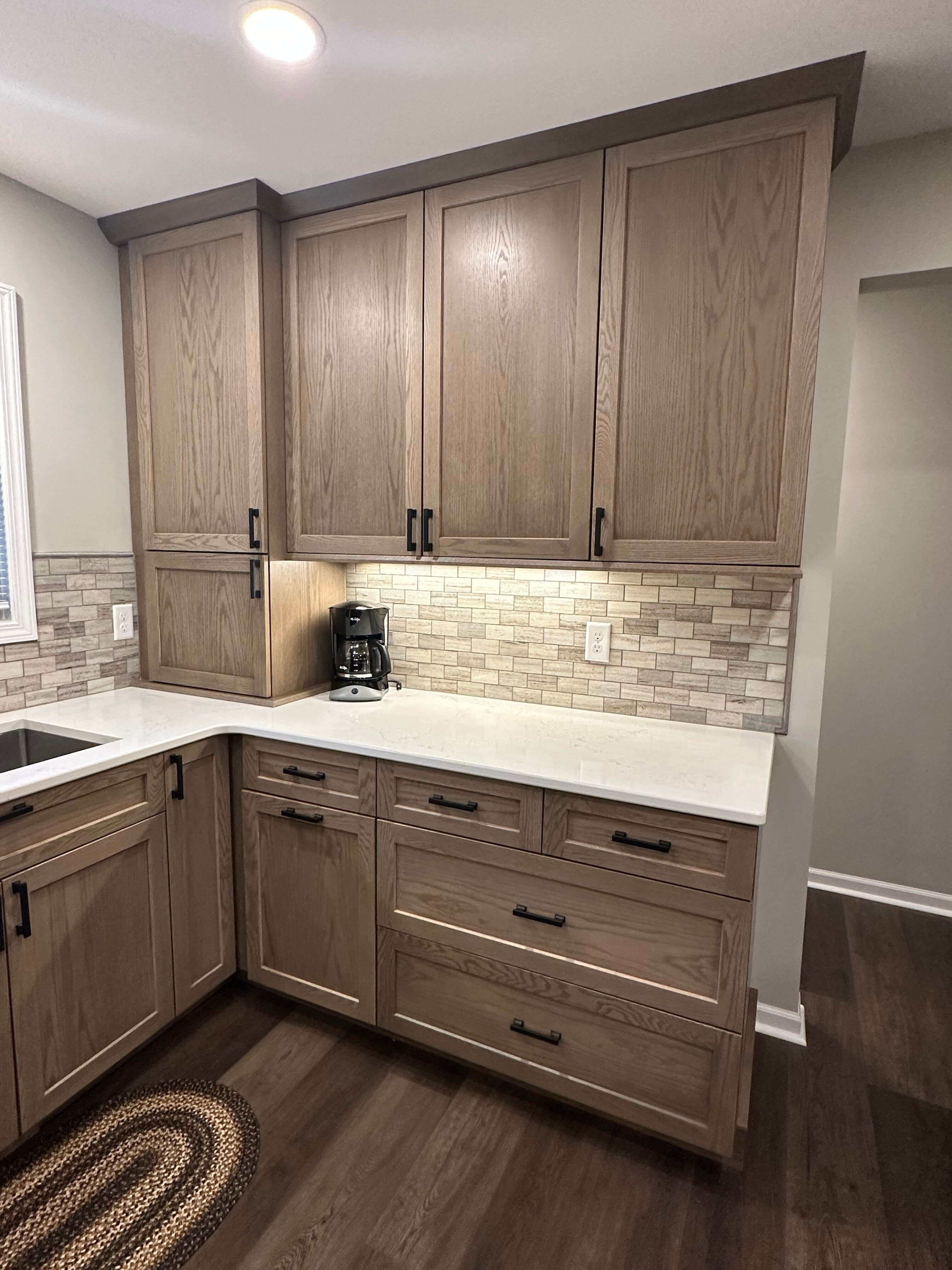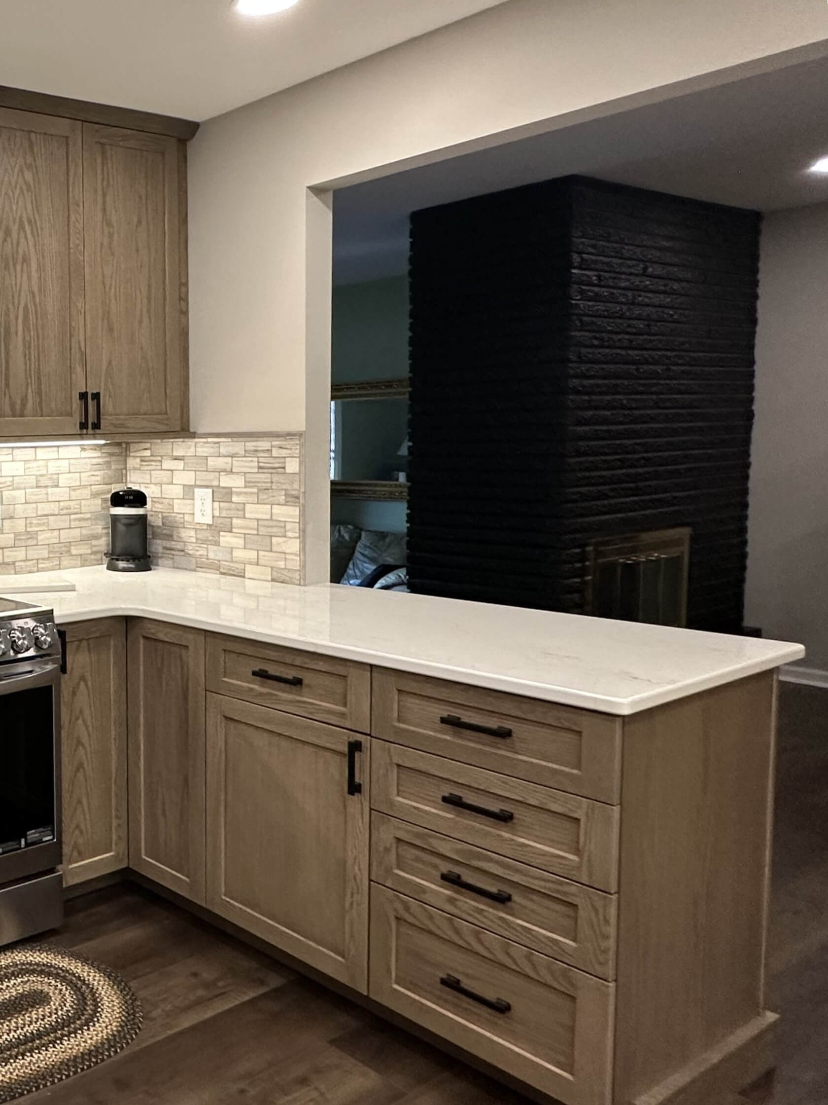 To complete to overall look of the design, Corian Quartz in Calacatta Villa was used for the countertops in the kitchen. The soft white background with buttery brown veining blends beautifully with the cabinets and new flooring. The simple Craftsman Crown was used to bring the cabinets to the ceiling, and the Bevel Bottom molding was used for the light rail. I even recommended she paint the two-sided brick fireplace right off the kitchen a dramatic black. She was unsure, but after sending her several Pinterest photos, she agreed and she loves how it turned out!