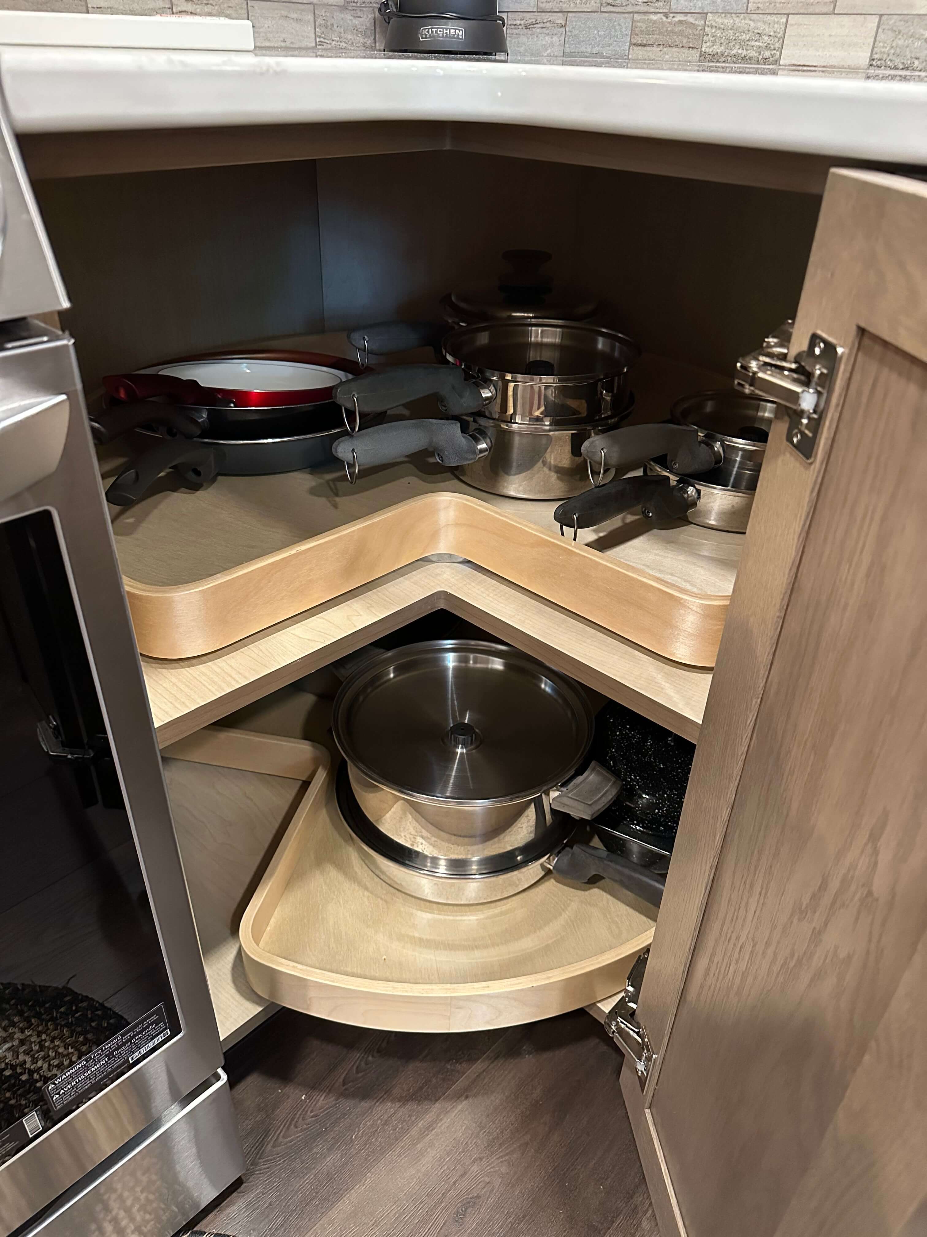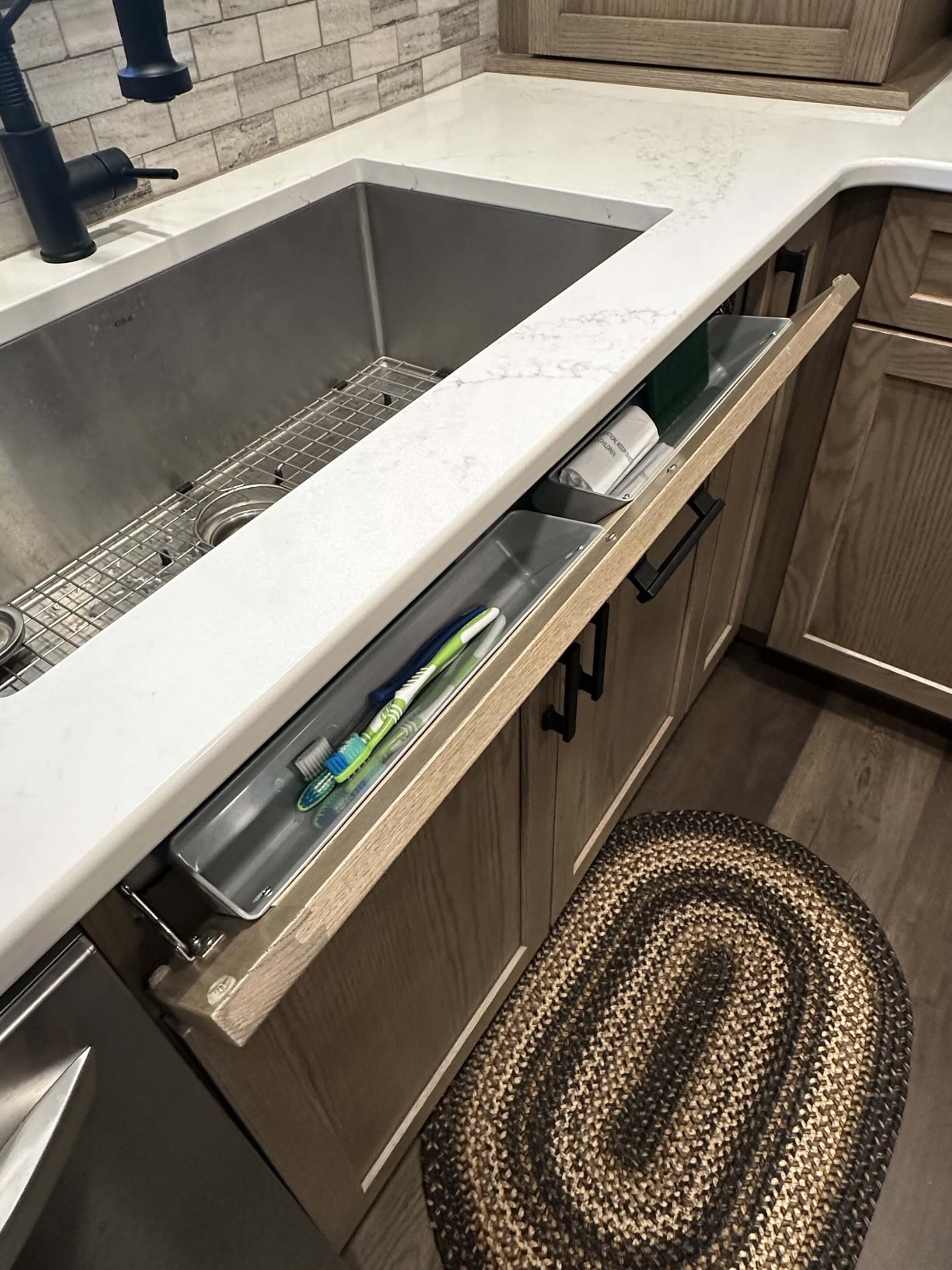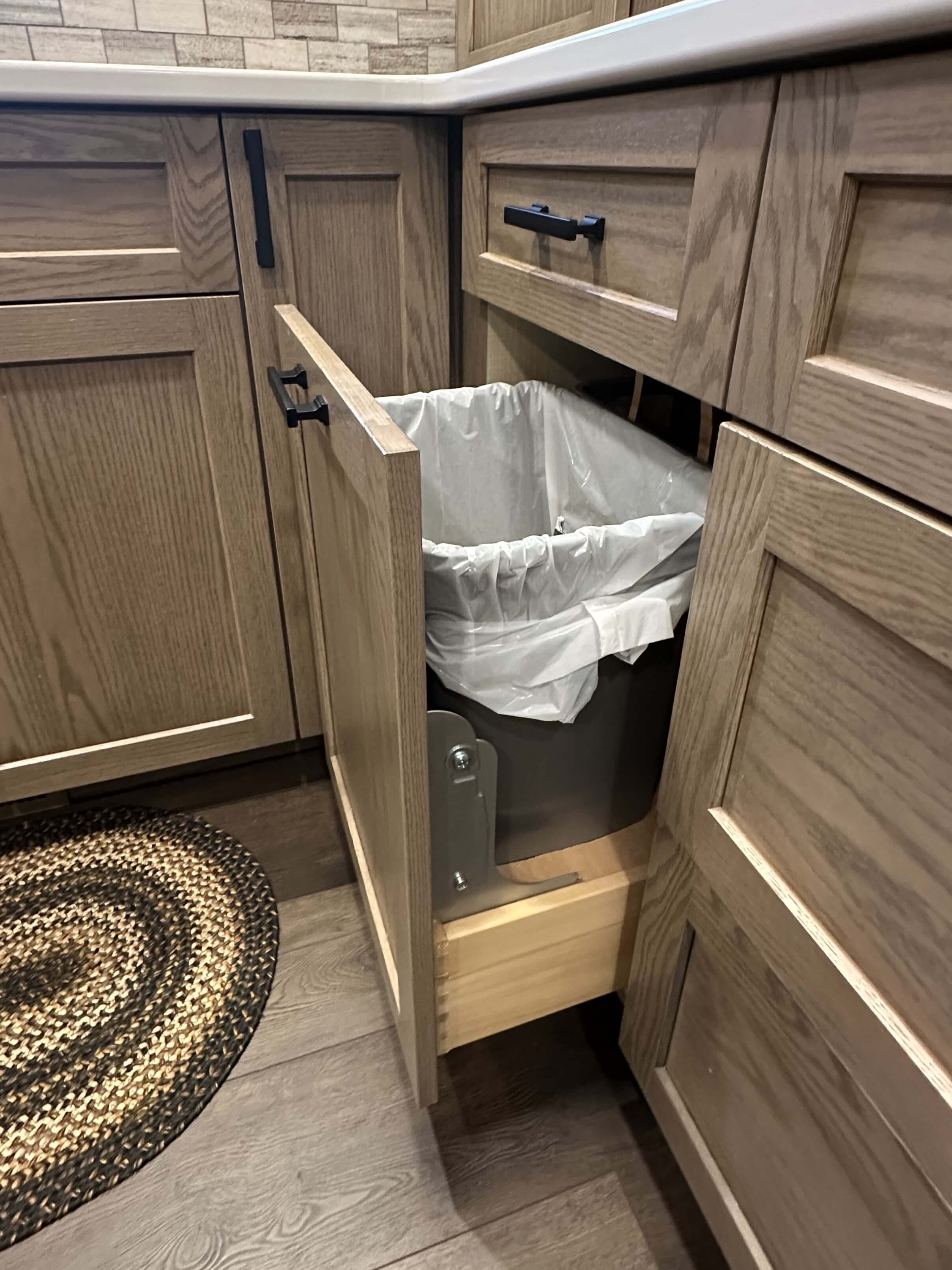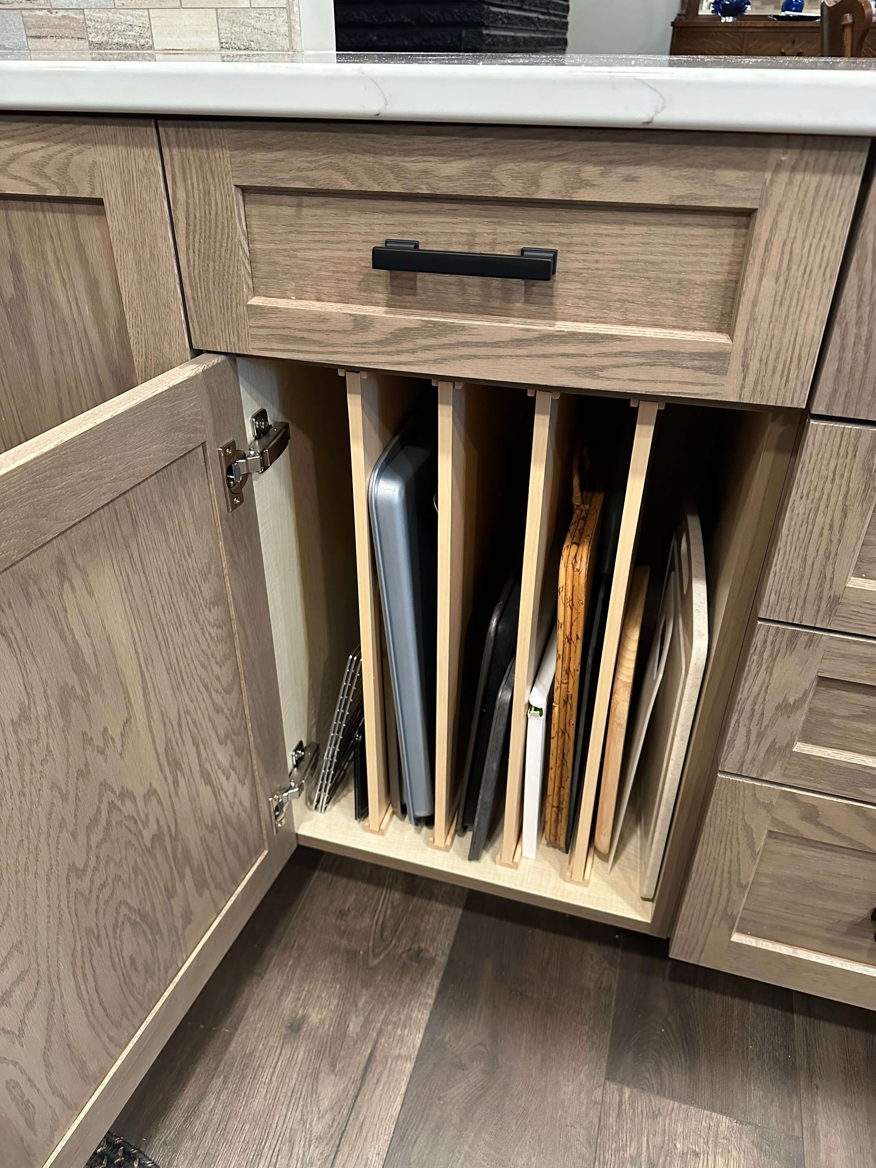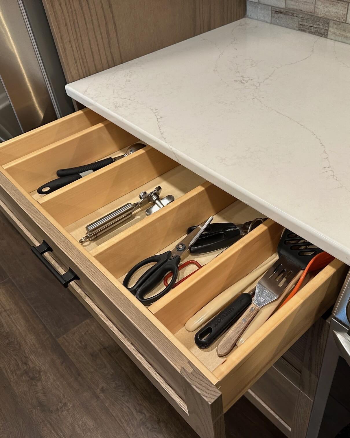 Storage is plentiful in the new design, with cabinets going to the ceiling and everything easily accessible for Gwen. Several in-cabinet conveniences were added to the design to help with storage and functionality, something she really desired in her new kitchen.