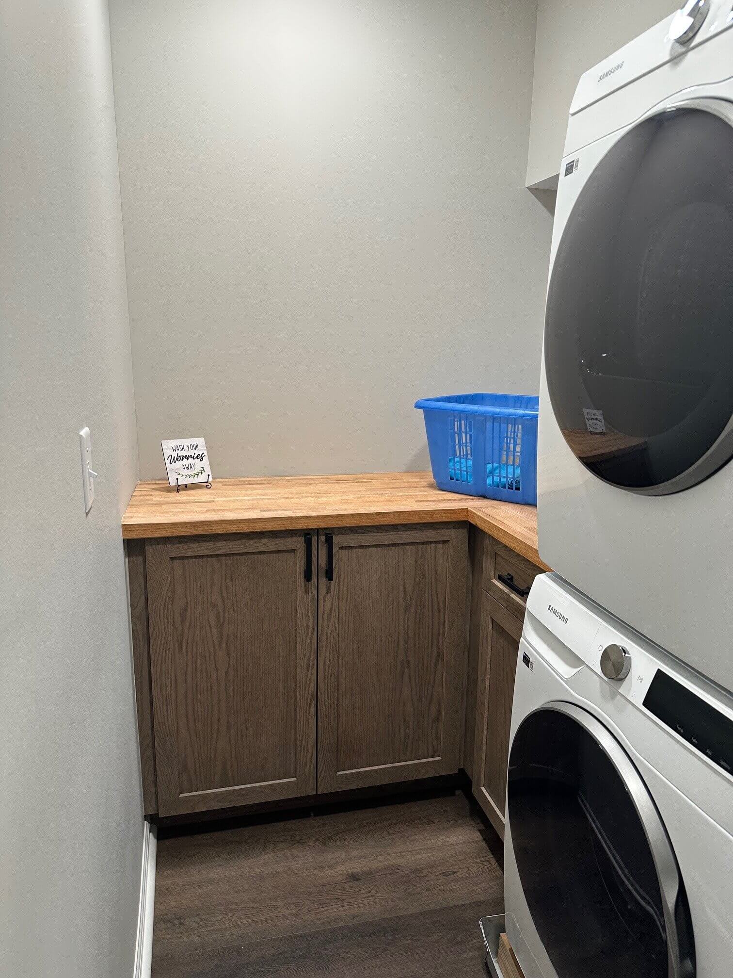 The back hall that was transformed into a small laundry room was a game-changer. It allowed Gwen to have a small stackable washer and dryer on the main living level without having to sacrifice the office in the spare bedroom. Additional base cabinets were used in the space for extra storage, and there is room for open shelving to be installed at a later date if needed. Plus, she still has the full size laundry set in the basement for larger loads like bedding and towels.