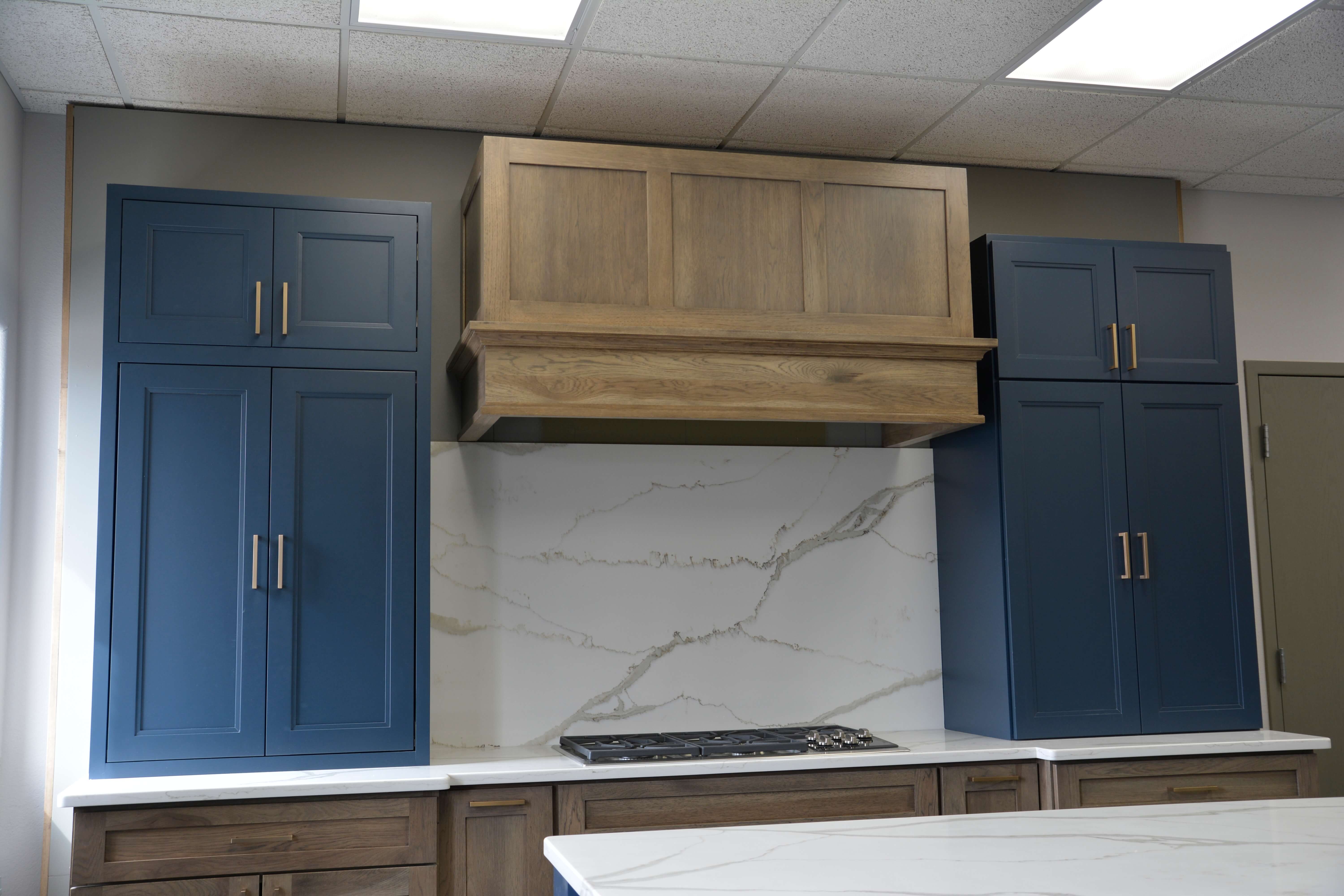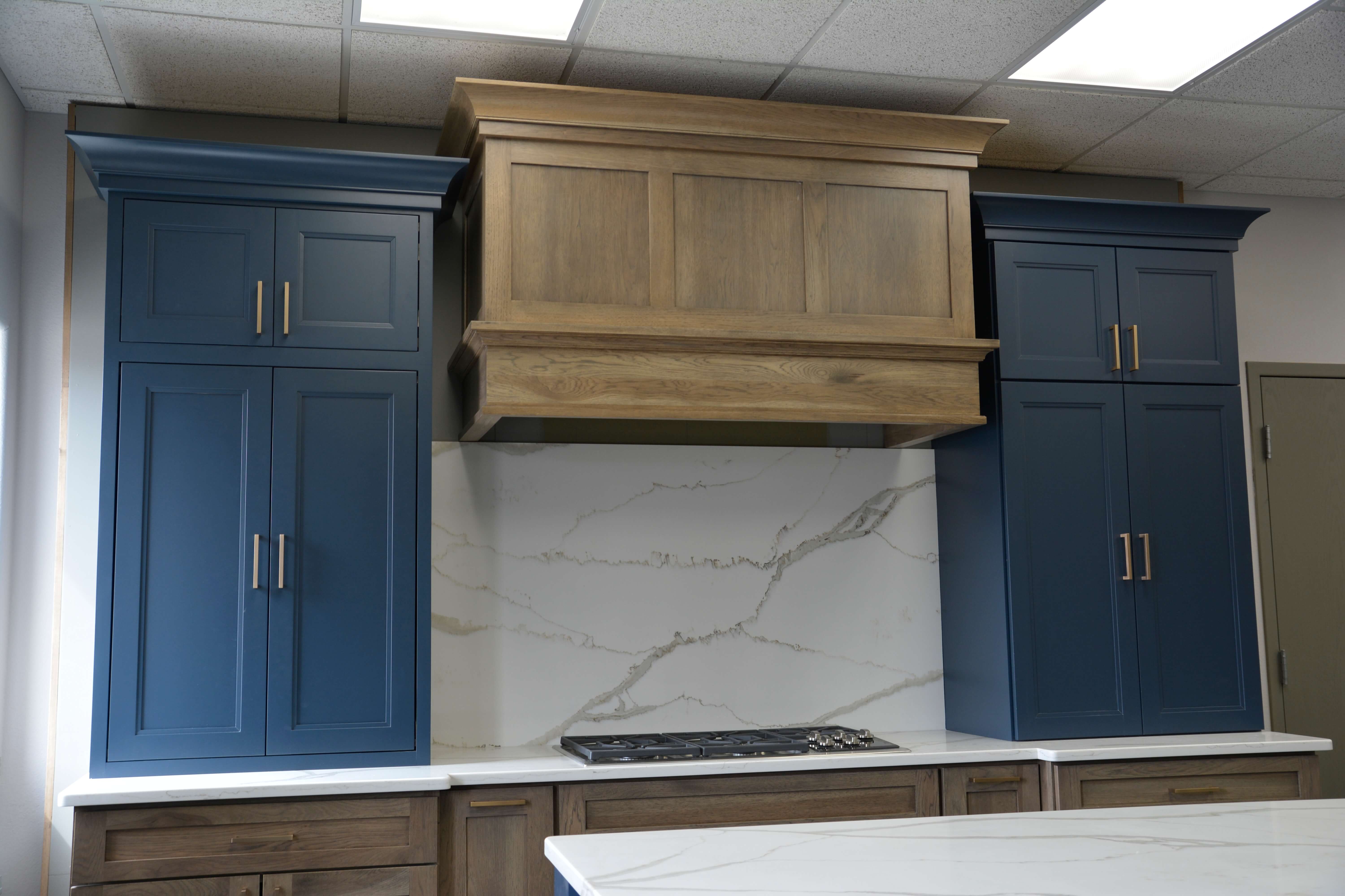 Our wood crown moldings range from traditional to contemporary and offer several sizes in each for the perfect balance. It is the one detail that should not be overlooked by a designer or homeowner. Sometimes it can be hard to visualize what crown molding will look like or how it can complete the look of cabinets, especially for many consumers. Below is a great before and after of cabinets at our training center with added crown molding. The transitional design is complete with a stacked crown molding detail on both the wall cabinets and decorative wood hood.