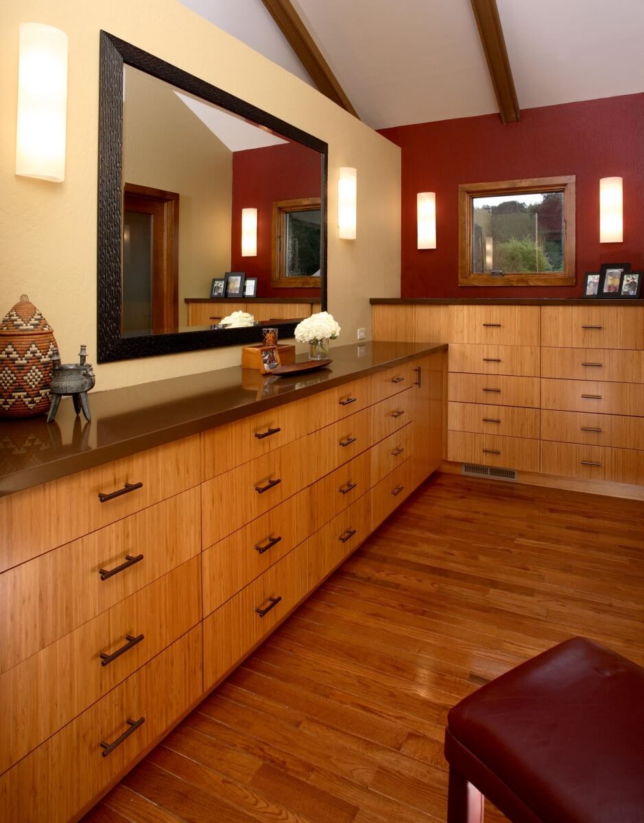 A master bath and closet featuring Dura Supreme’s Metro door style in the vertical grain option, featuring the Natural Bamboo exotic veneer, creates warmth with a modern vibe.