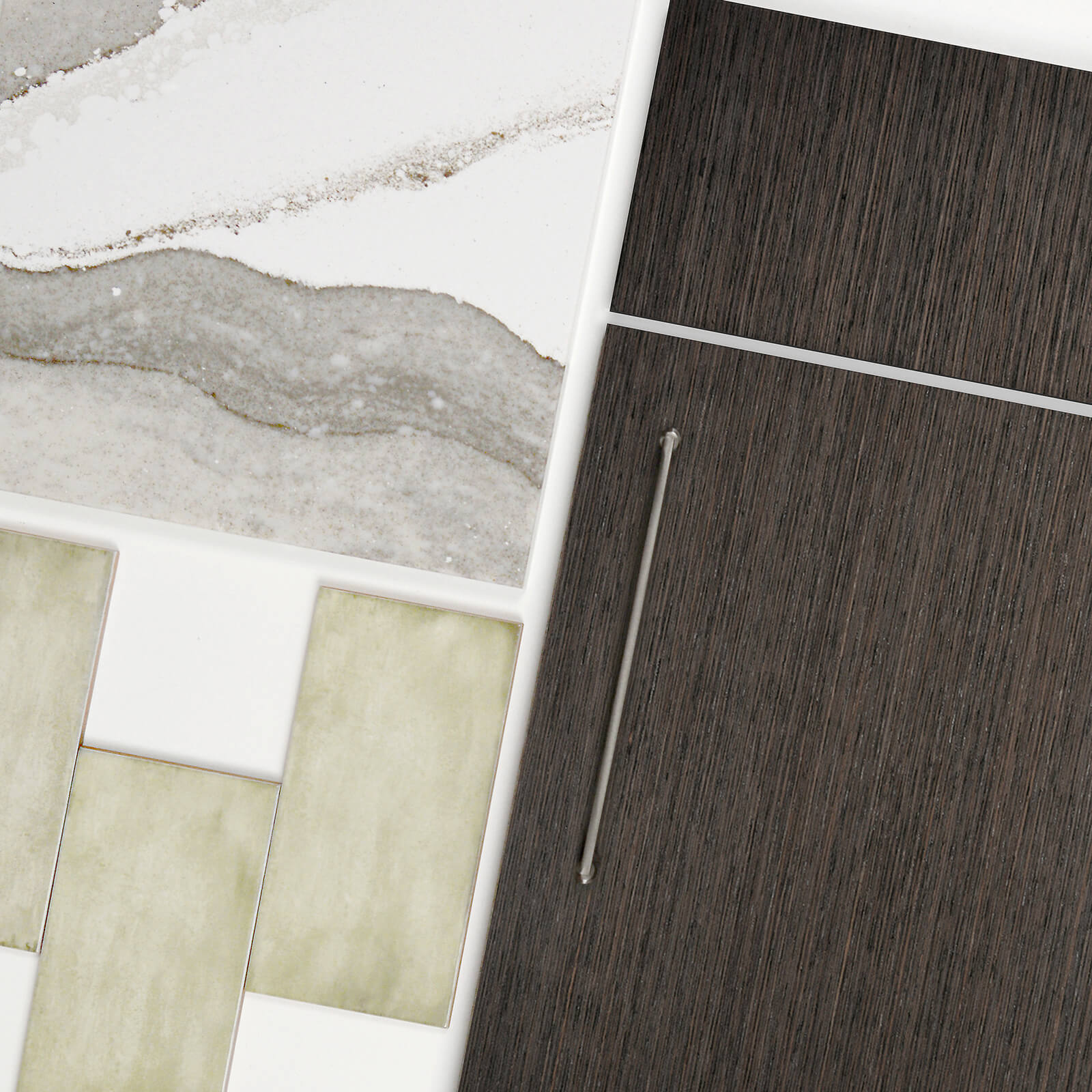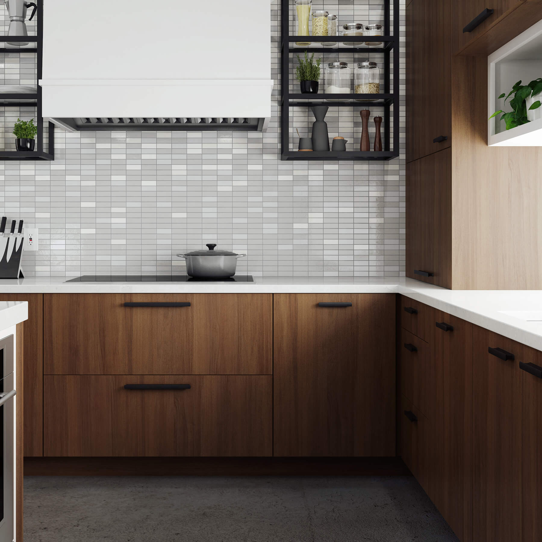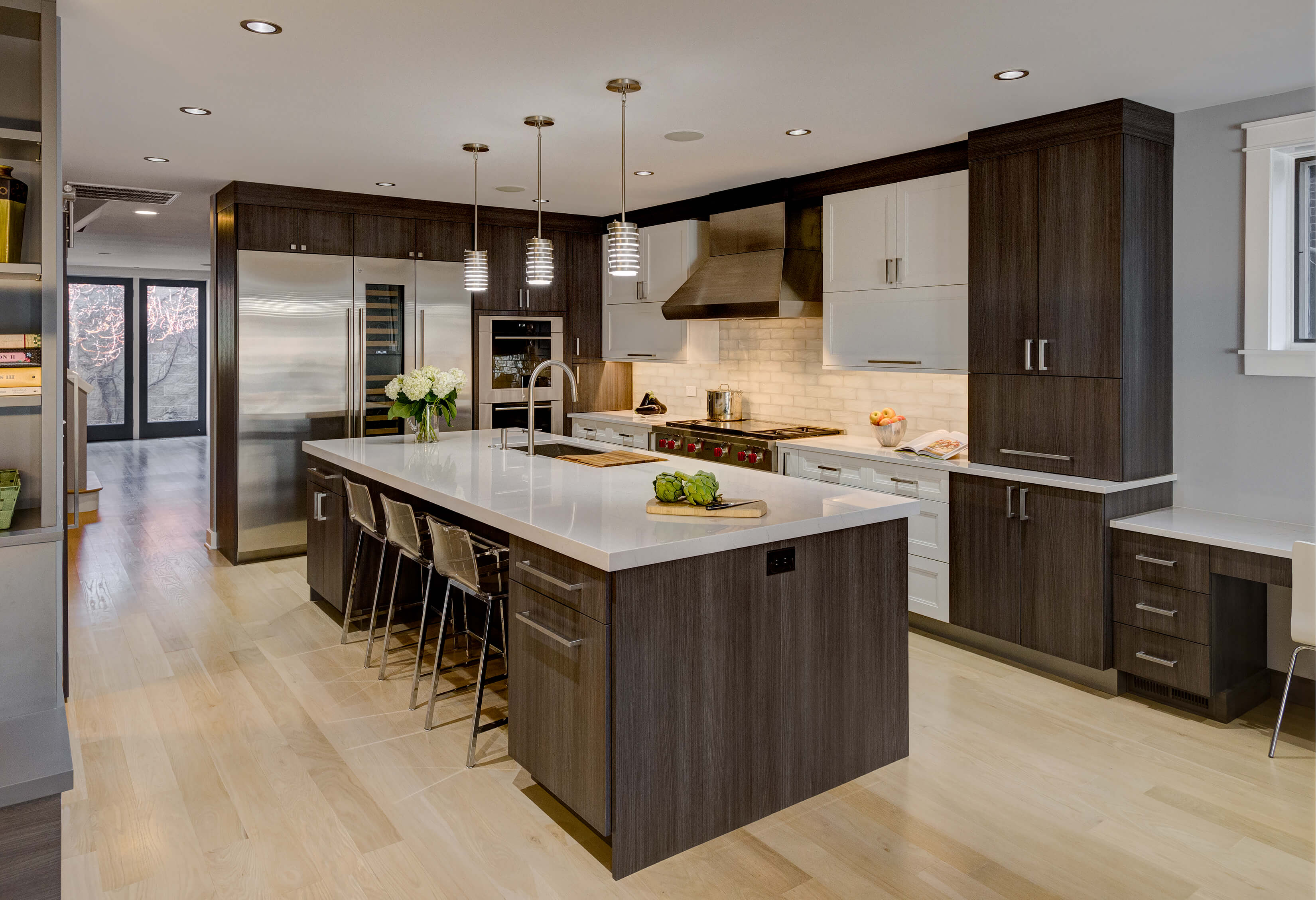 Dura Supreme’s Metro-Vertical door style in Walnut with a Hazelnut stain combined with the Reese skinny shaker door style in Pearl paint.
