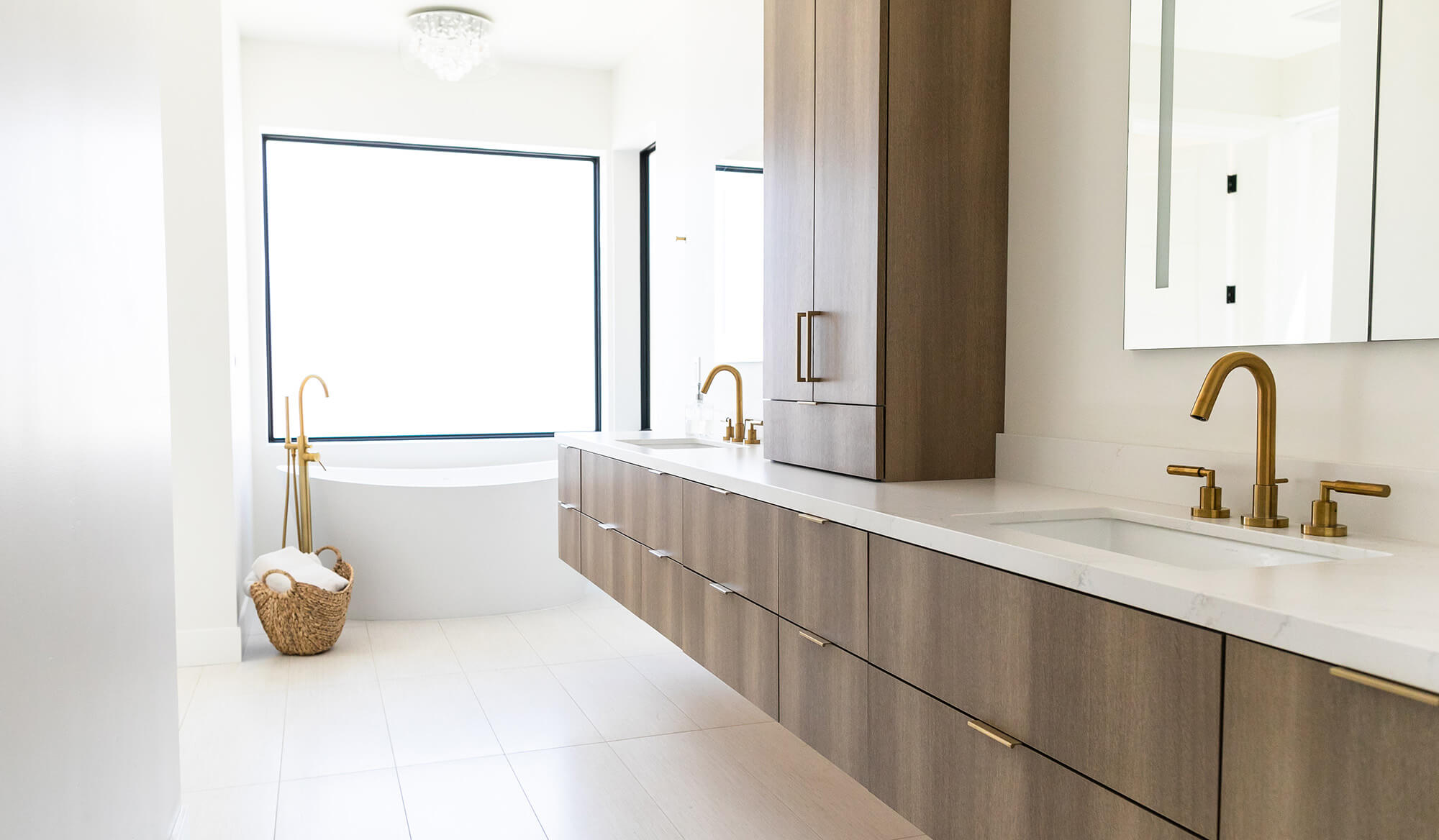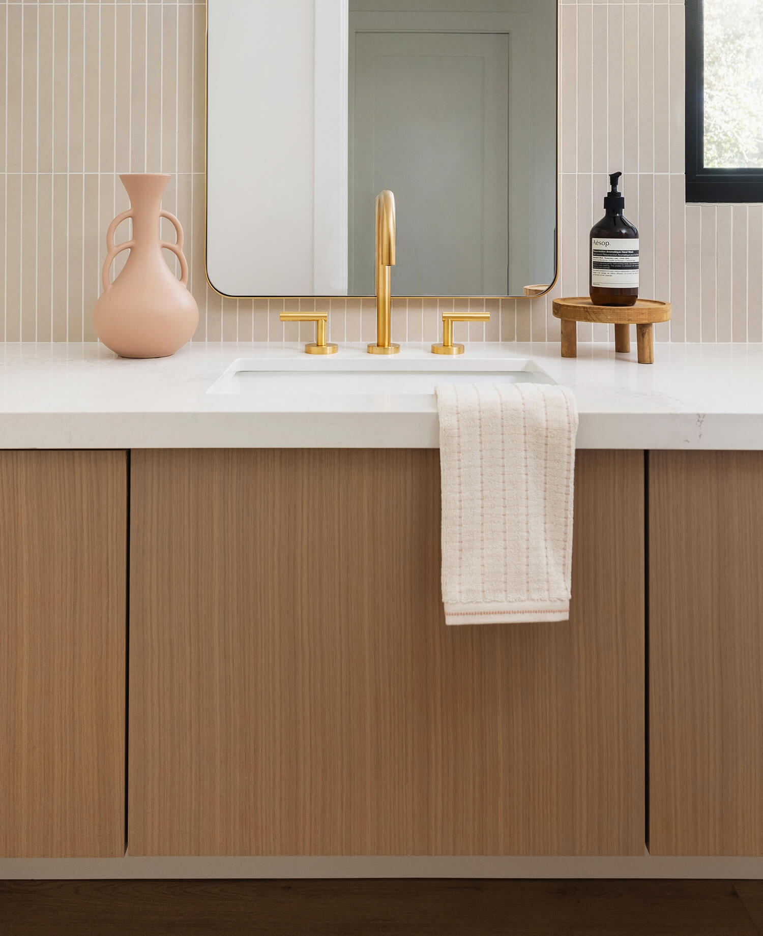 This spa-inspired bathroom features the Metro-Vertical door style in a Natural finish on Straight Grain Oak exotic veneer, showcasing a vertical grain pattern. Bathroom design by Honeycomb Home Design in Arroyo Grande, California. Photo by Lisa Maksoudian.
