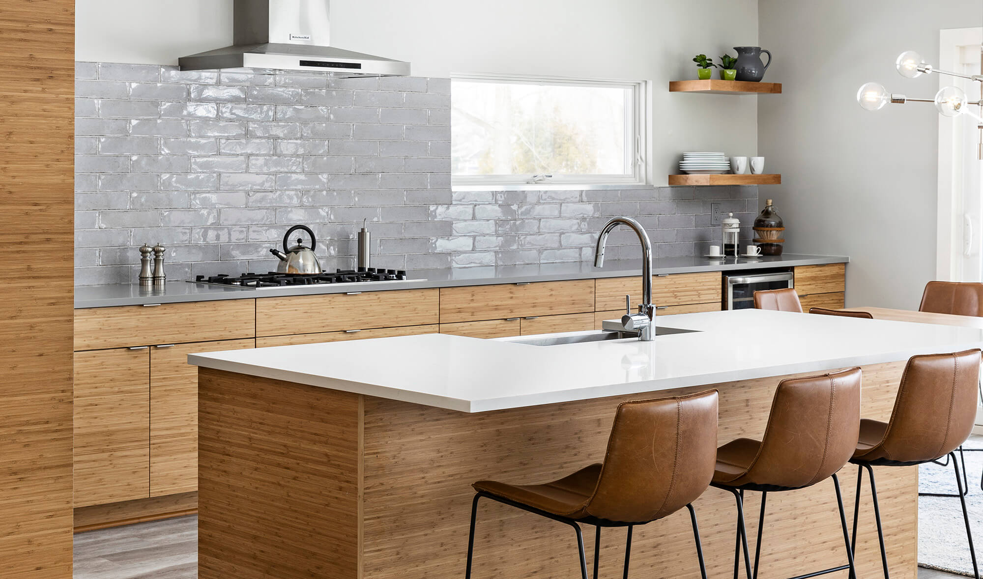 Dura Supreme’s Bria Frameless cabinets use the Metro door style in Natural Bamboo Exotic Veneer with horizontal grain, accented with Aluminum Frame doors.