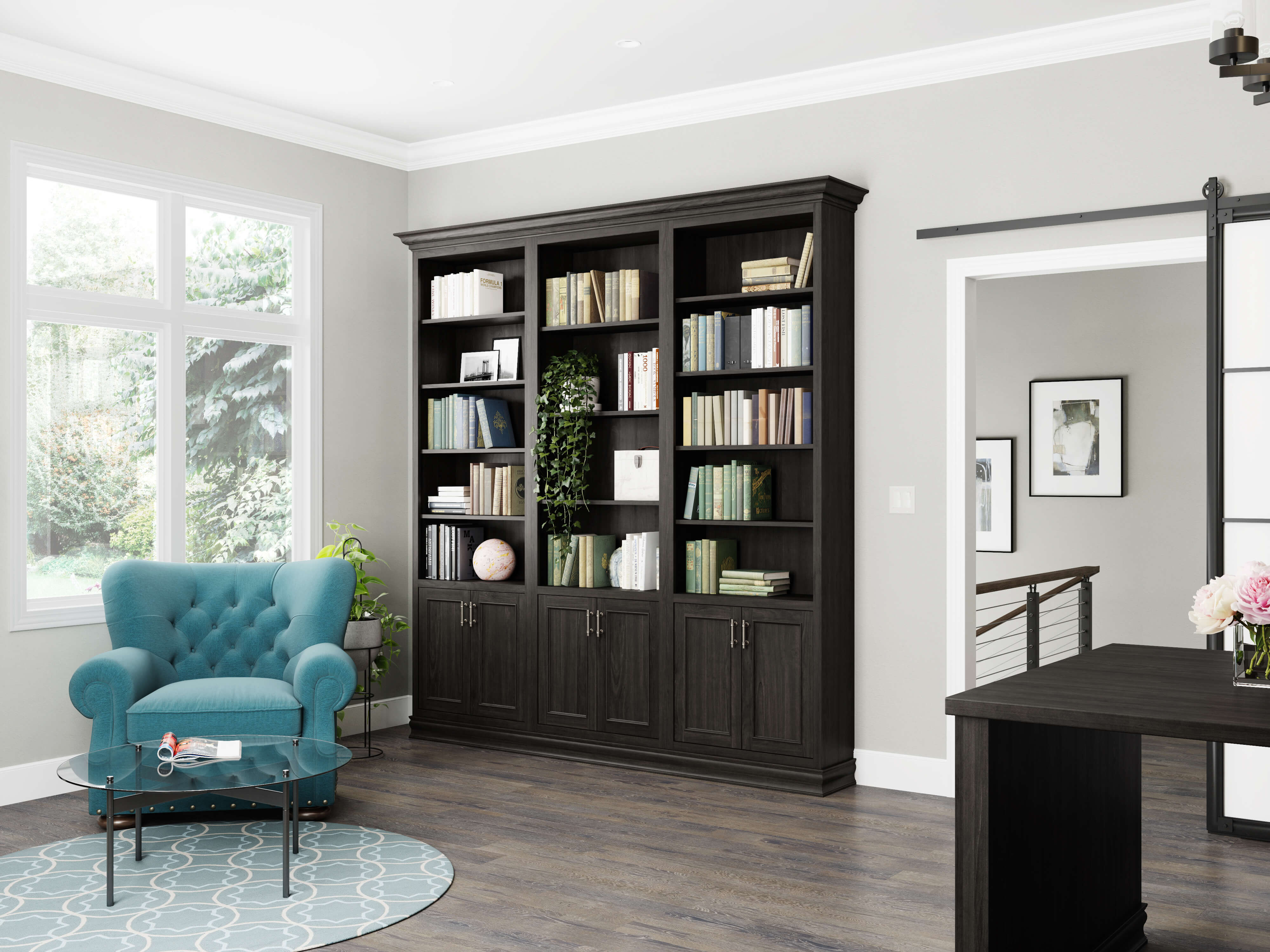 Home office featuring Dura Supreme’s Chapel Hill Panel Inset door style in Onyx stained Cherry.