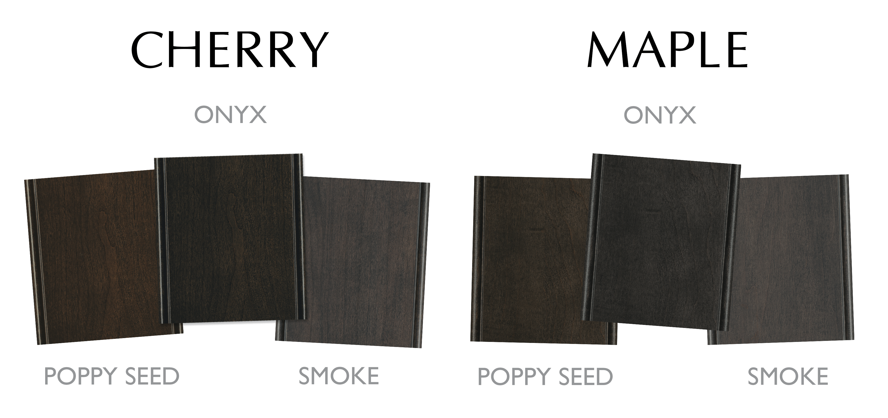 Below you can see how Onyx fits on the black spectrum. Poppy Seed is a deep, dark finish with reddish-brown undertones, and Smoke comes off more gray and somewhat blurs the grain of the wood.