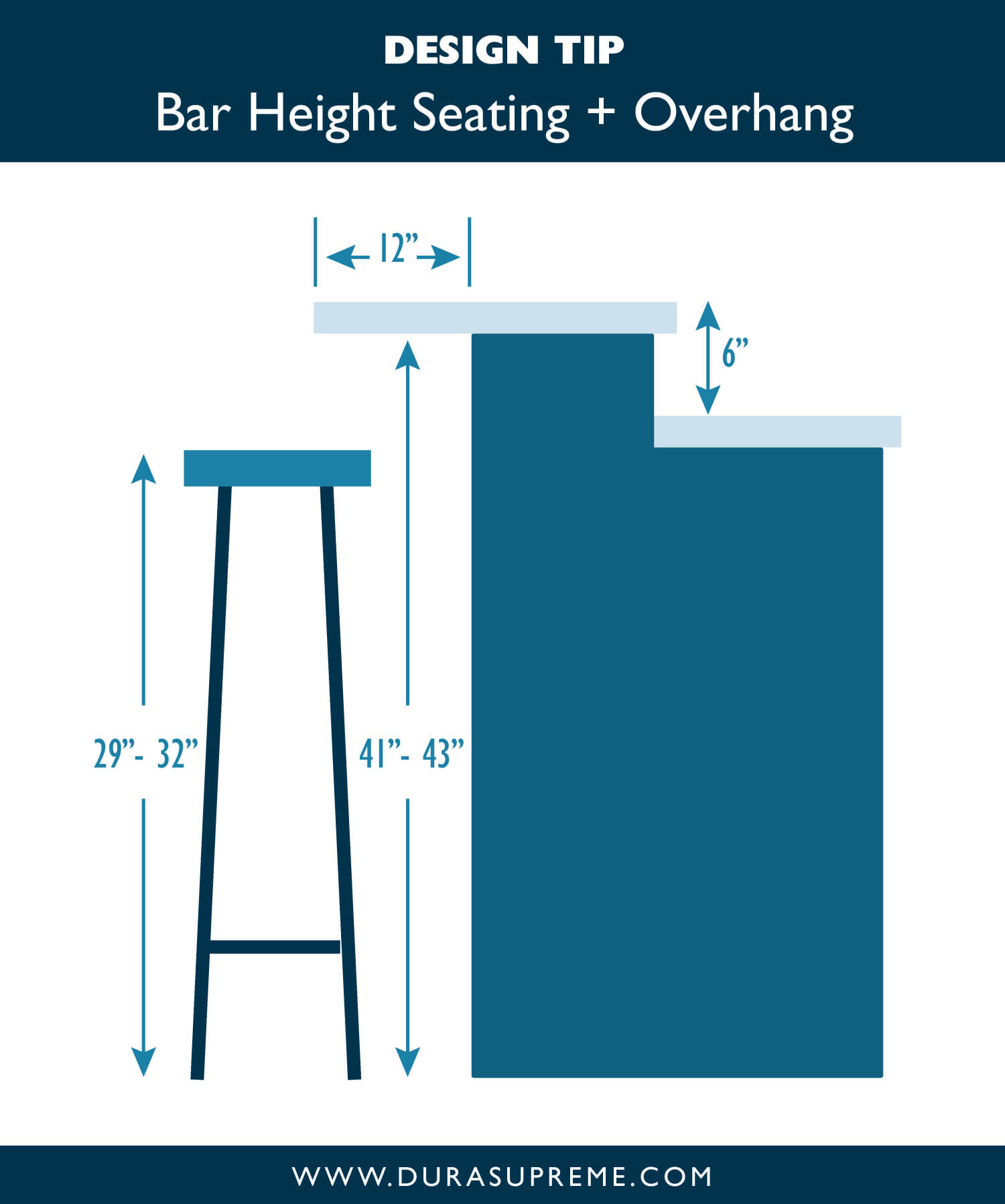 If you opt for bar height seating at 41”- 43″ off the floor, the recommended overhang measurements for knee space is 12”, and the stool height would be 30”. Ensure that the edge of the countertop is properly aligned to provide the recommended knee space for bar height seating. With this countertop height, it is also a good idea to consider the ages and abilities of those who would be sitting at a higher counter. Small children and tall stools sometimes are not the best combination.
