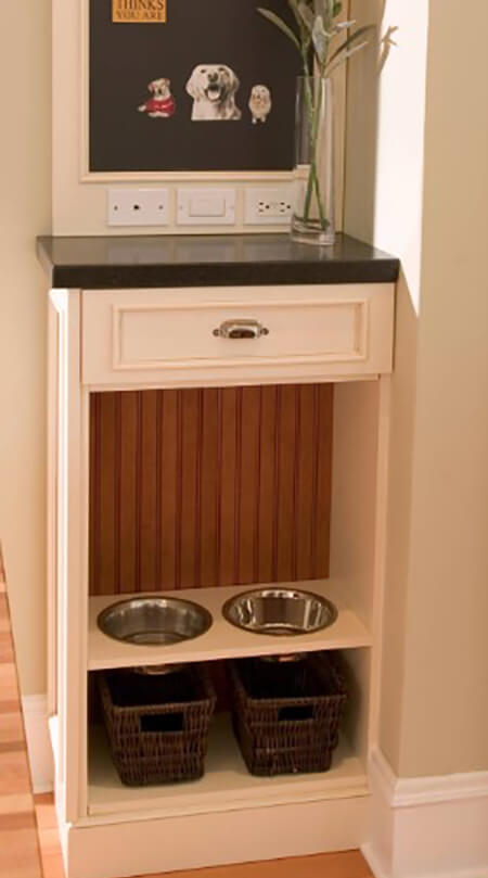 In my discussions with homeowners and other designers around the country, there has been a growing interest and I will go so far as to say demand for designing intentional spaces for pets in the home. While a comfortable resting spot or well-placed feeding station may seem like a borderline frivolous perk for a furry friend, there is actually a lot to be said for how these types of accommodations can make life easier for the humans in the house as well. Consider a feeding station… food and water bowls smartly tucked in the lower portion of the cabinetry with food storage, treats and other pet supplies organized nearby all in one area. The convenience of this, not to mention no longer potentially bumping the bowl while walking by is priceless. The bowls can also be set at a height that is ergonomically and digestively better for the animal. Countertop material can be used as a base surrounding the bowls to ensure everything looks as nice in 10 years as it looked on day one.