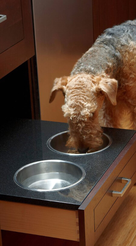 Below is a home with 2 dogs, two bowls for food and one for water, notice the thoughtful lighting tucked up above the bowls and the creative handle cut-outs, keeping leashes and snacks close.