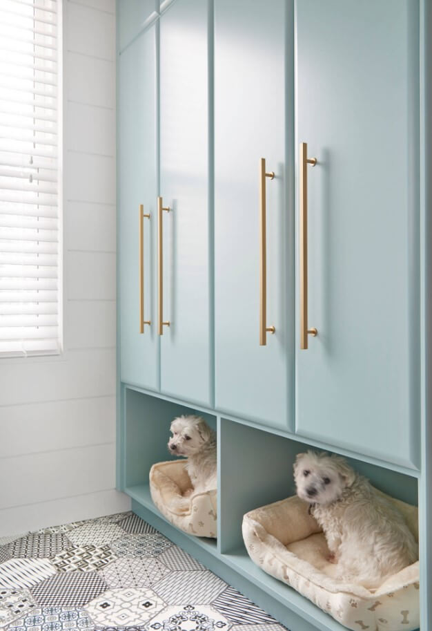 How many people use the laundry room or mudroom to contain their pets while away? Why not integrate pet space into these rooms? Not only will this make the space feel larger (no pet beds/toys taking up floor space), but it is safe, secure, and beautiful.