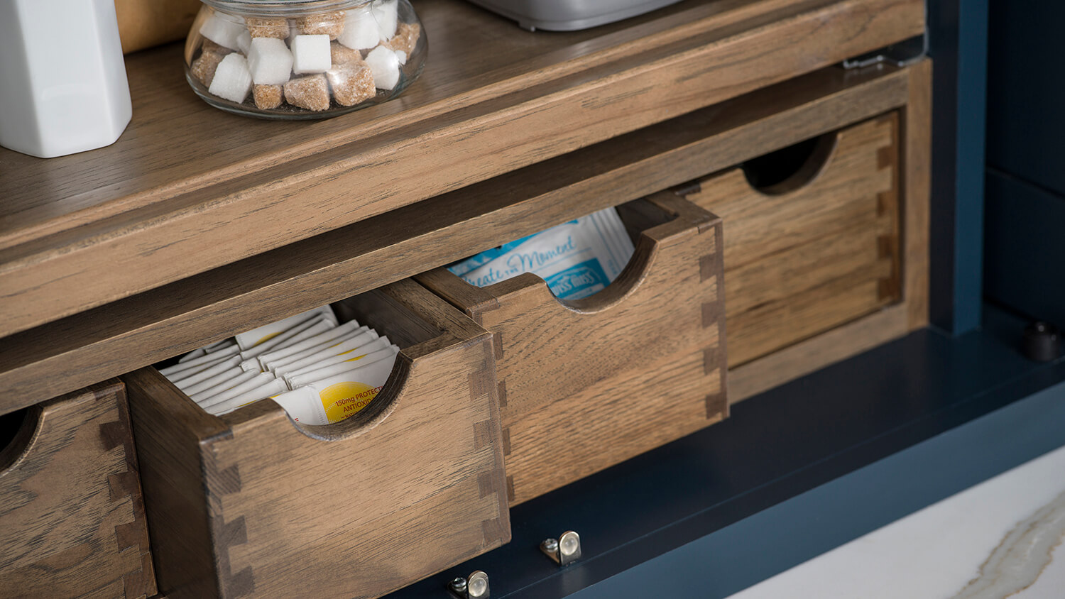 Horizontal or Vertical Apothecary Drawers are beautiful and are great for storing and sorting small misc. items like tea bags, sugar packets, k-cups, stir stickand cocoa packages, etc.
