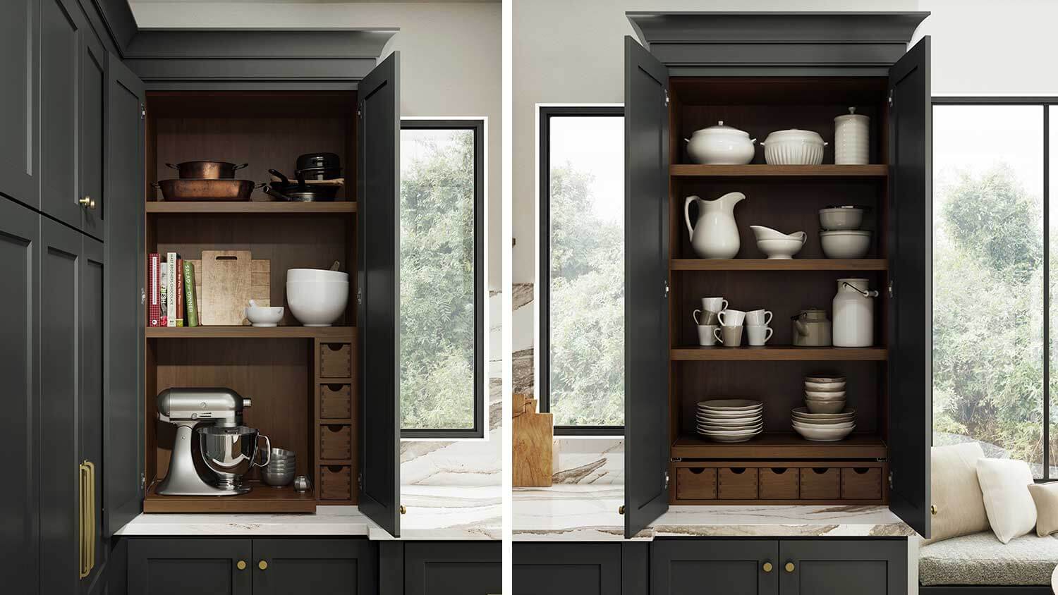 Dura Supreme Cabinetry’s Baking Center Larder (shown on the left) and Storage Center Larder (shown on the right).