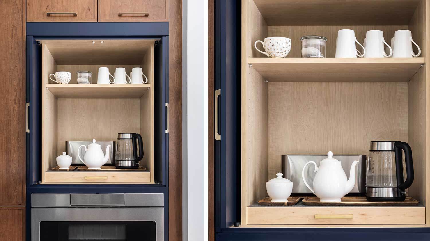 With a simple movement of a cabinet door an entire baking center can be concealed when company arrives, or revealed when it’s time to bake.