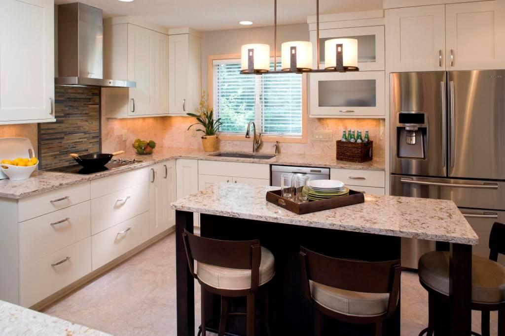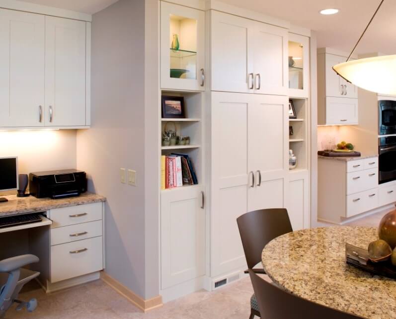 The homeowner had several specific requests for her new kitchen space. She wanted a convenient desk area along with open, built-in units to display photos, artwork, and books. An eat-in dining space within the kitchen was another factor for being able to utilize the space more effectively. Even though floor space was at a premium, she definitely wanted a kitchen island with seating so that her kids could do homework in the kitchen and have a place to hang out with their friends.