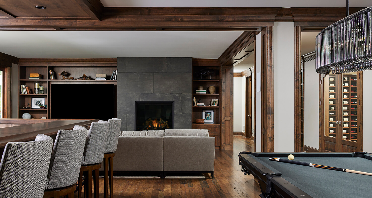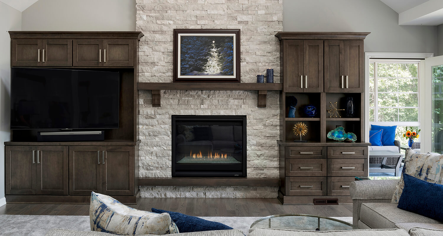 Dura Supreme entertainment center and fireplace mantel designed by Kristen Peck of Knight Construction Design, Inc., Chanhassen, Minnesota. Photography by Mark Ehlen of Ehlen Creative.