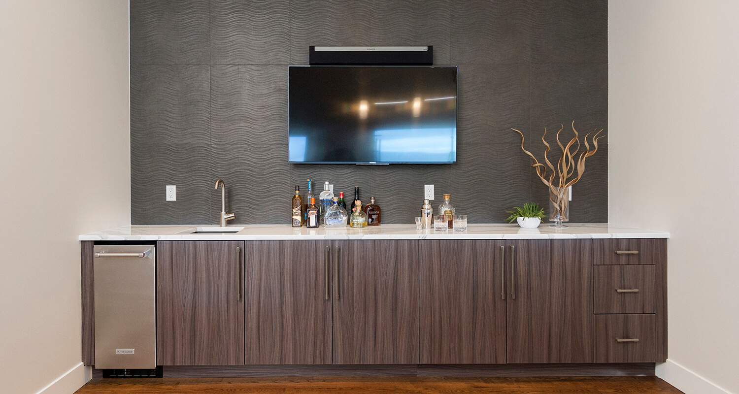 These pocket doors in an entertainment center beautifully hide a full home bar workstation for mixing and serving drinks when the homeowner has guests to entertain. Design by Revival House, Twin Cities, Minnesota.