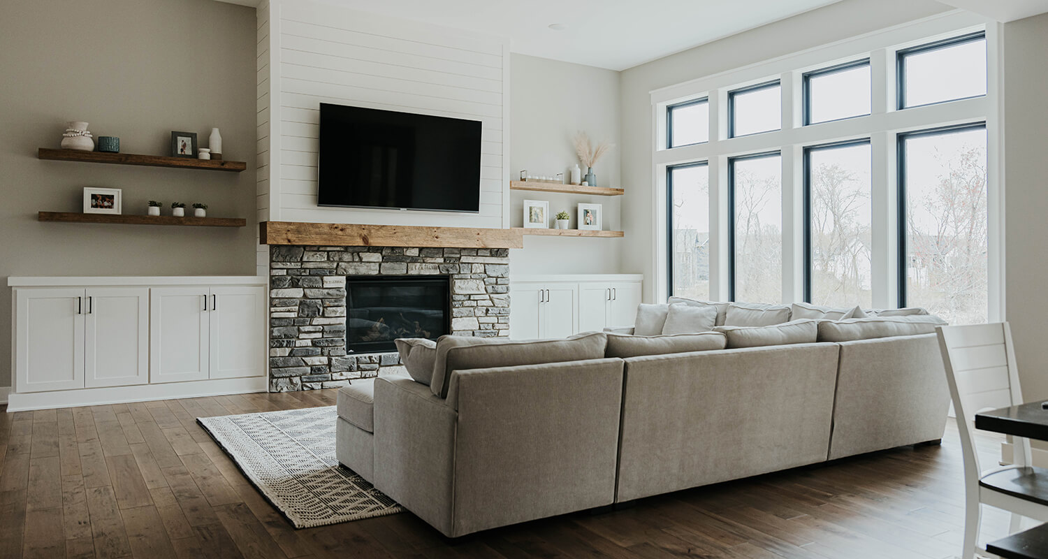 A beautiful new construction home with a built-in entertainment center around the fireplace.
