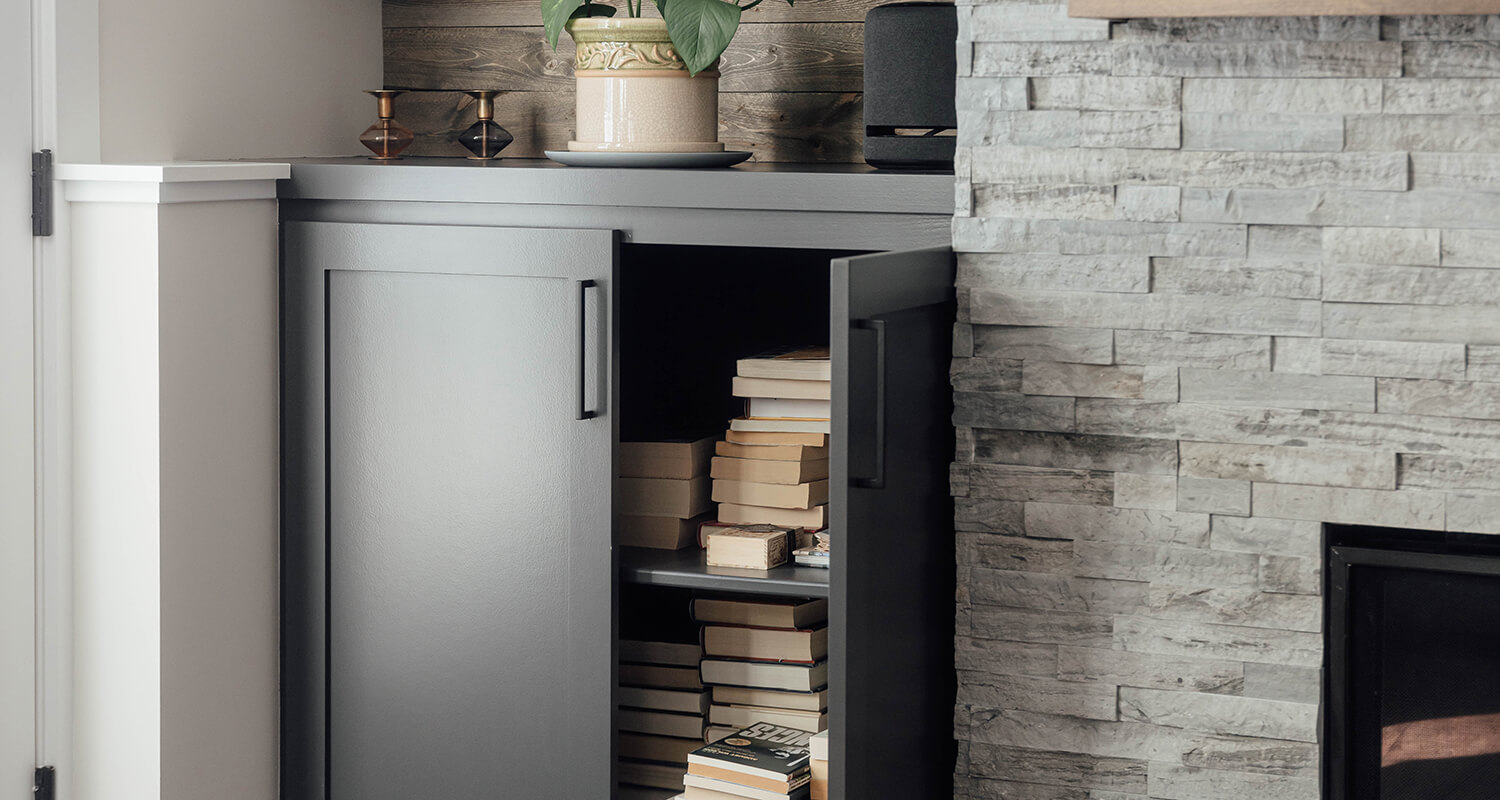 Miscellaneous items can find a home in a Dura Supreme Toe-Kick Drawer hidden at the foot of your entertainment center cabinets. This handy solution can give your gaming controllers and accessories a home, helping your living space clutter-free and your equipment easy to access.