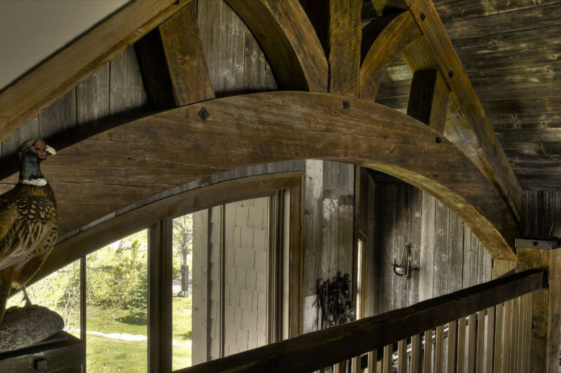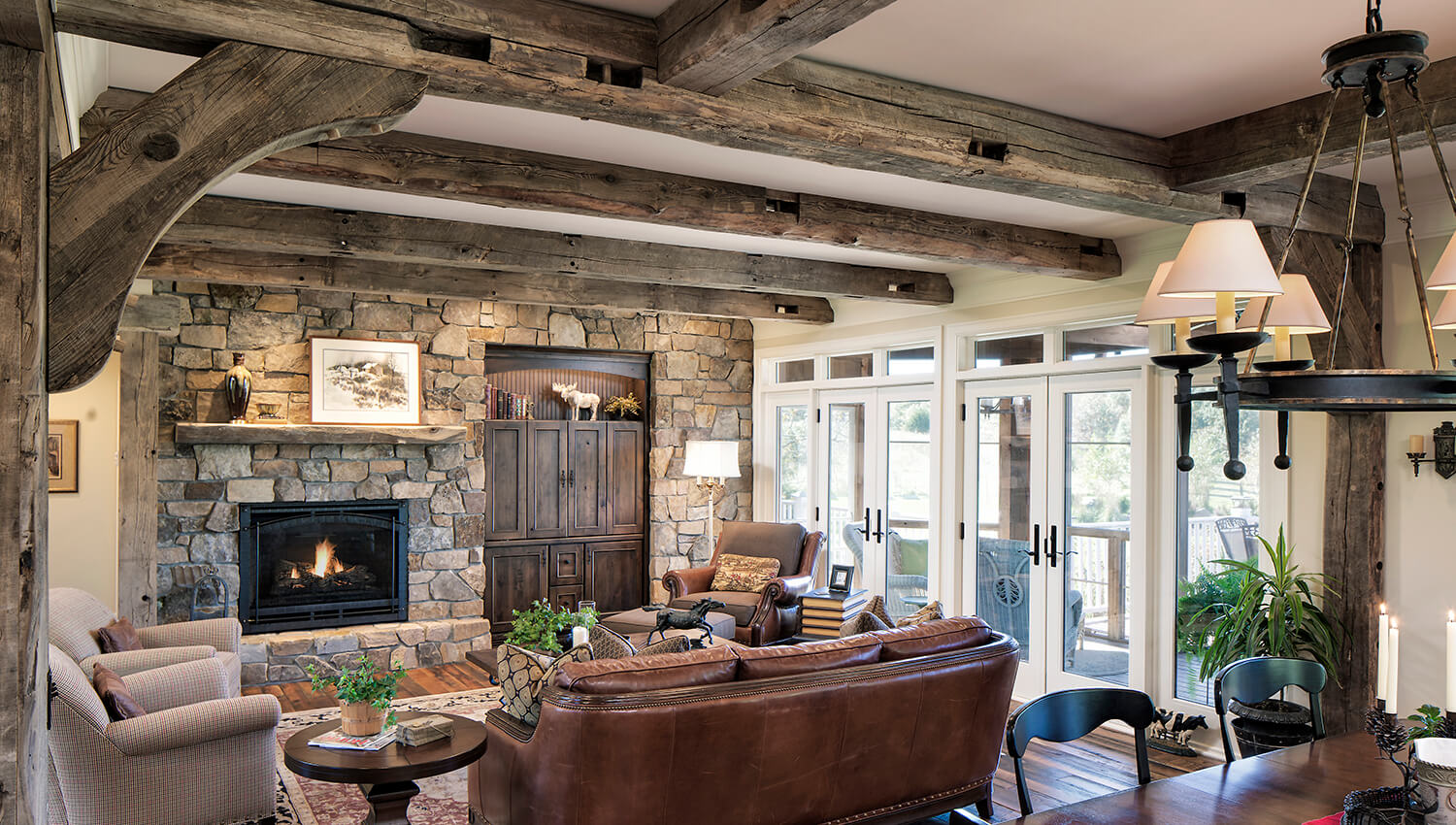 Go big, bold, and heavy when selecting architectural details and furniture. Rustic furnishings and cabinetry will typically feature hefty turned posts or legs and wide columns. The architectural designs typically feature large windows that capture the beautiful views of the surrounding landscapes to help create a harmonious connection between the outdoors and the interior of the home. Massive & elaborate exposed structural beams are a staple architectural feature in rustic-style homes.