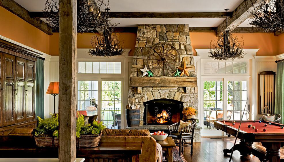 It’s all about texture, texture, and can you guess? More Texture! This is why many times you hear of textures and materials in other design styles referred to as “Rustic”. Rustic style is famous for rugged, worn, raw, and distressed textured materials that fully embrace the natural beauty of the great outdoors. Look for painted and metal surfaces that have an aged, industrial, or antiqued look, and select wood finishes with rich character, dramatic grain patterns, and knotted details. The rough look of natural stone, bark, leather, and furs can also add more rustic-inspired texture to your design.