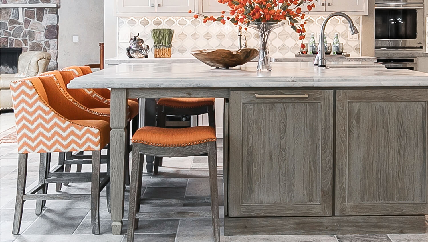 In the kitchen shown below, the vibrant orange color of the fall-inspired floral arrangement inspired the bright orange fabric on the kitchen island bar stools. The color is only used as an accent and appears just on a few decor items and does not take over.