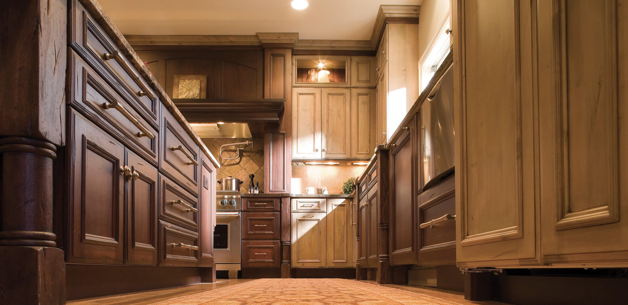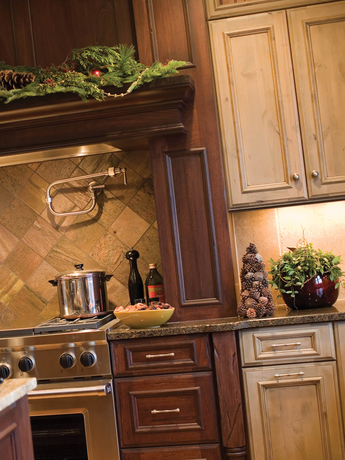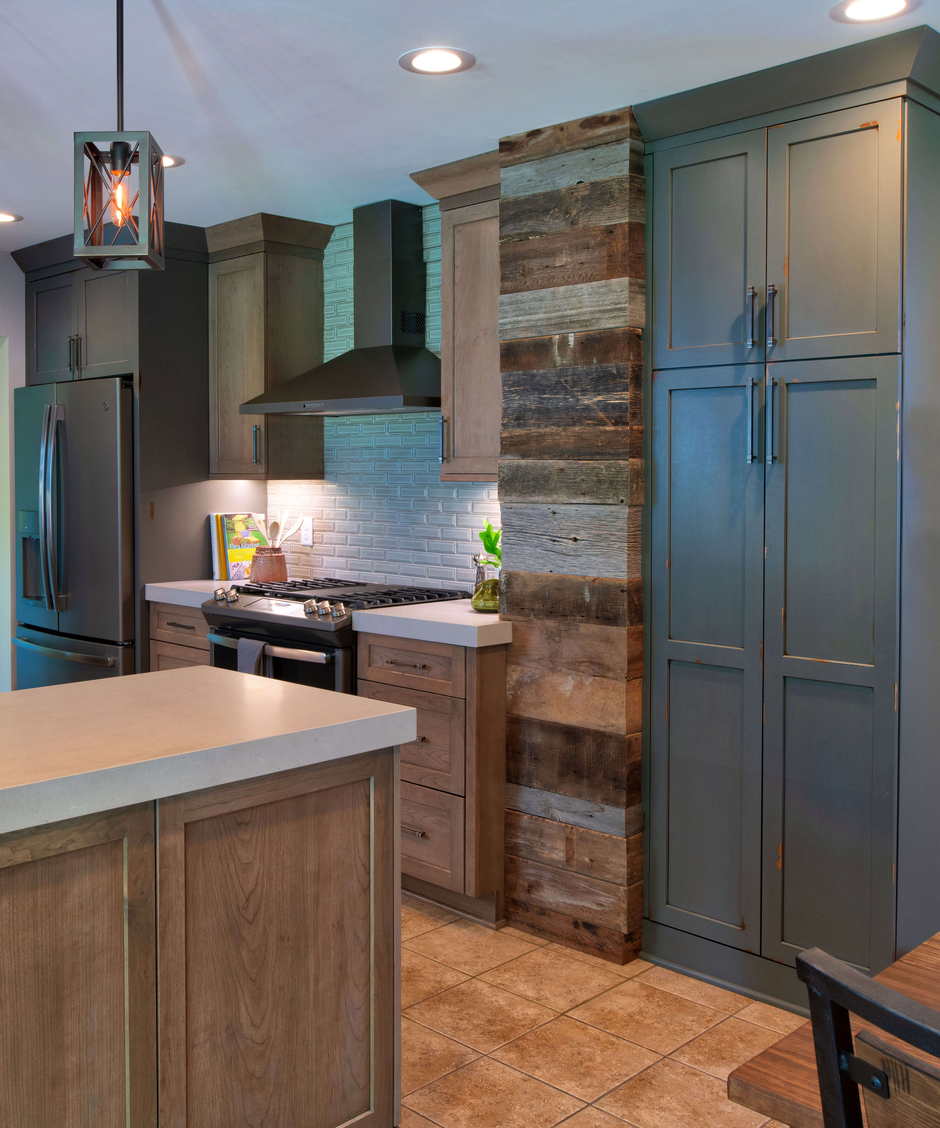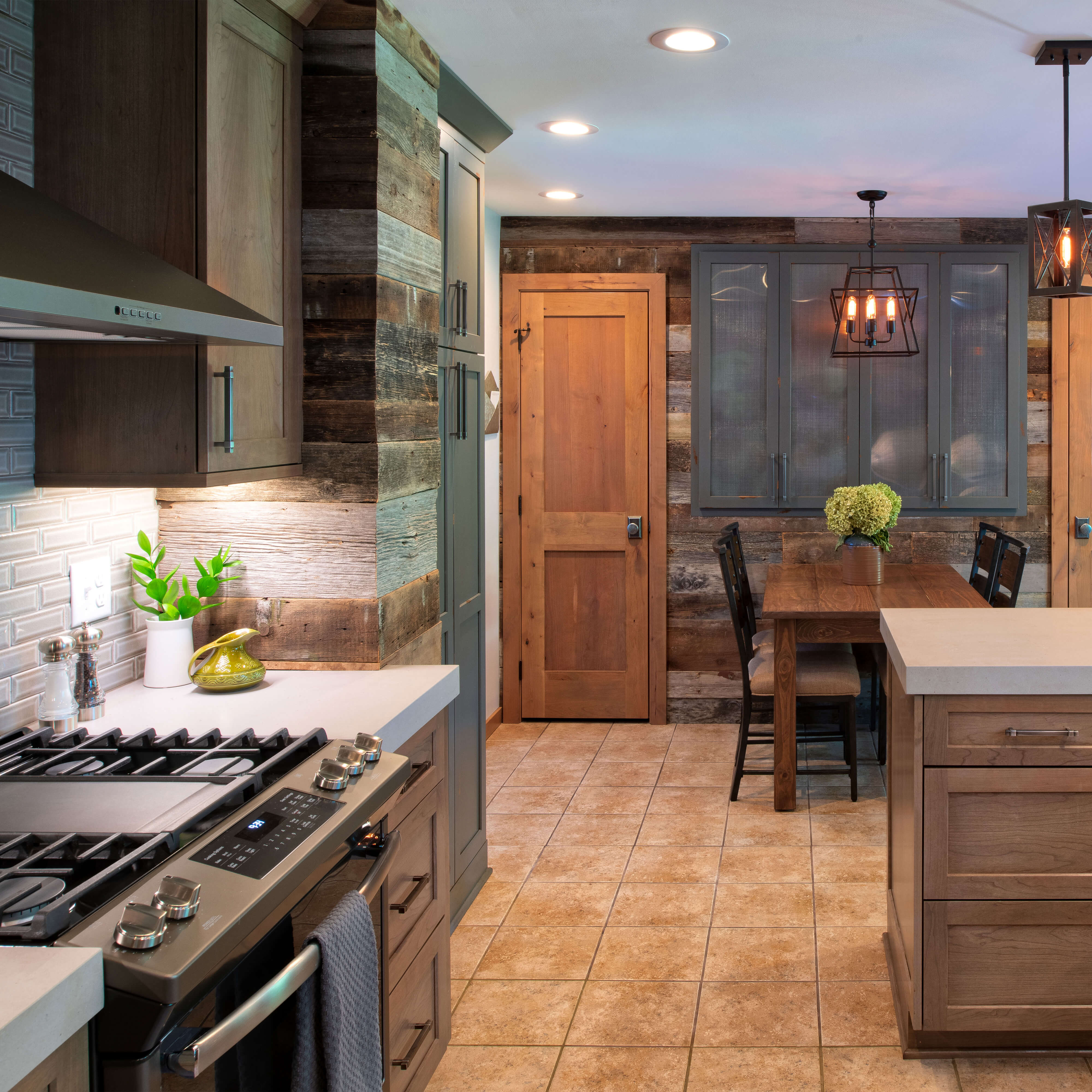 Here’s an example of two-tone cabinetry mixing wood species and finishes to create a Rustic kitchen design.