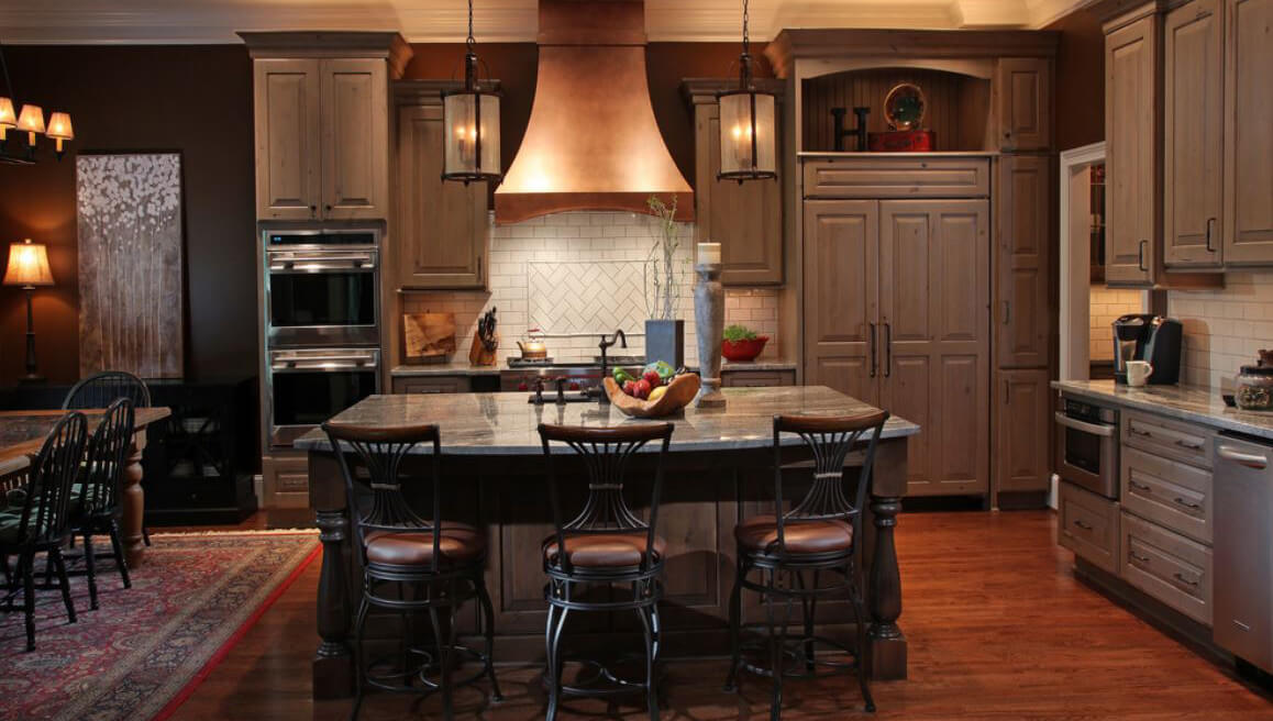 Rustic Traditional takes classic traditional styling to a casual, cozy place. Taking influence from the past, this kitchen design style brings rugged mountain landscapes and luscious textures of the forest inside the home. Decor and furnishings can be eclectic with a mixture of styles, fabrics, and finishes. Traditional architecture is embraced and design features like fireplaces are dramatized with pronounced shapes & raw stones. Vaulted ceilings are embellished with reclaimed-looking beams, logs, or shiplap. You’ll see a wider variety of decor and furnishings and more traditional architectural details throughout the space.