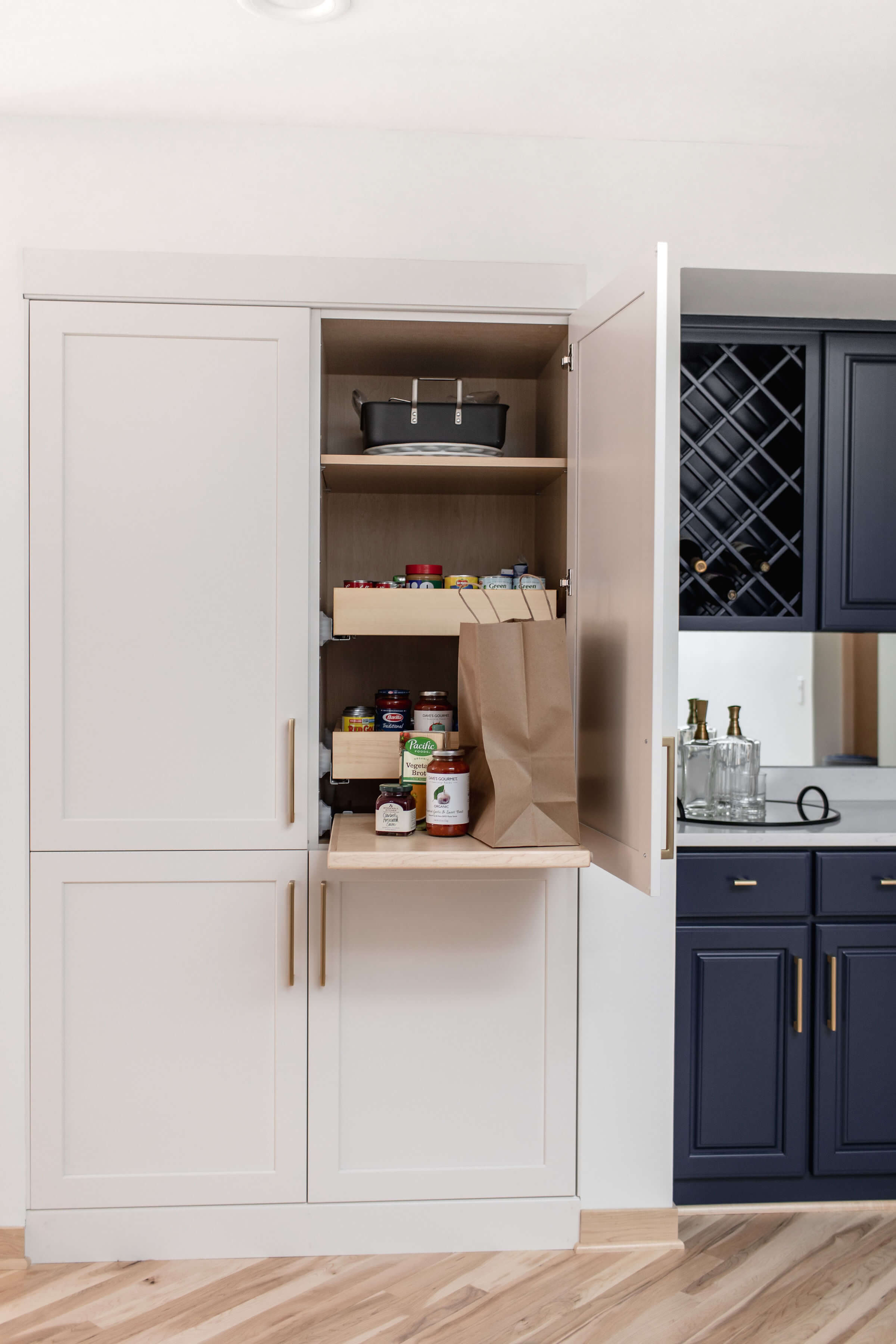 A pantry that contains a large collection of non-perishable foods (i.e. canned goods, pasta, cooking oils, baking supplies, etc.) can be easily managed with a small or large pull-out or roll-out pantry cabinet. Pull-out pantry cabinets neatly store row after row of pantry goods within a narrow space making it easy to see the entire contents of your pantry at a glance. They can also be great in a tight space without much room for a door swing. Finally, this is a great option easing the process of tracking inventory and expiration dates.