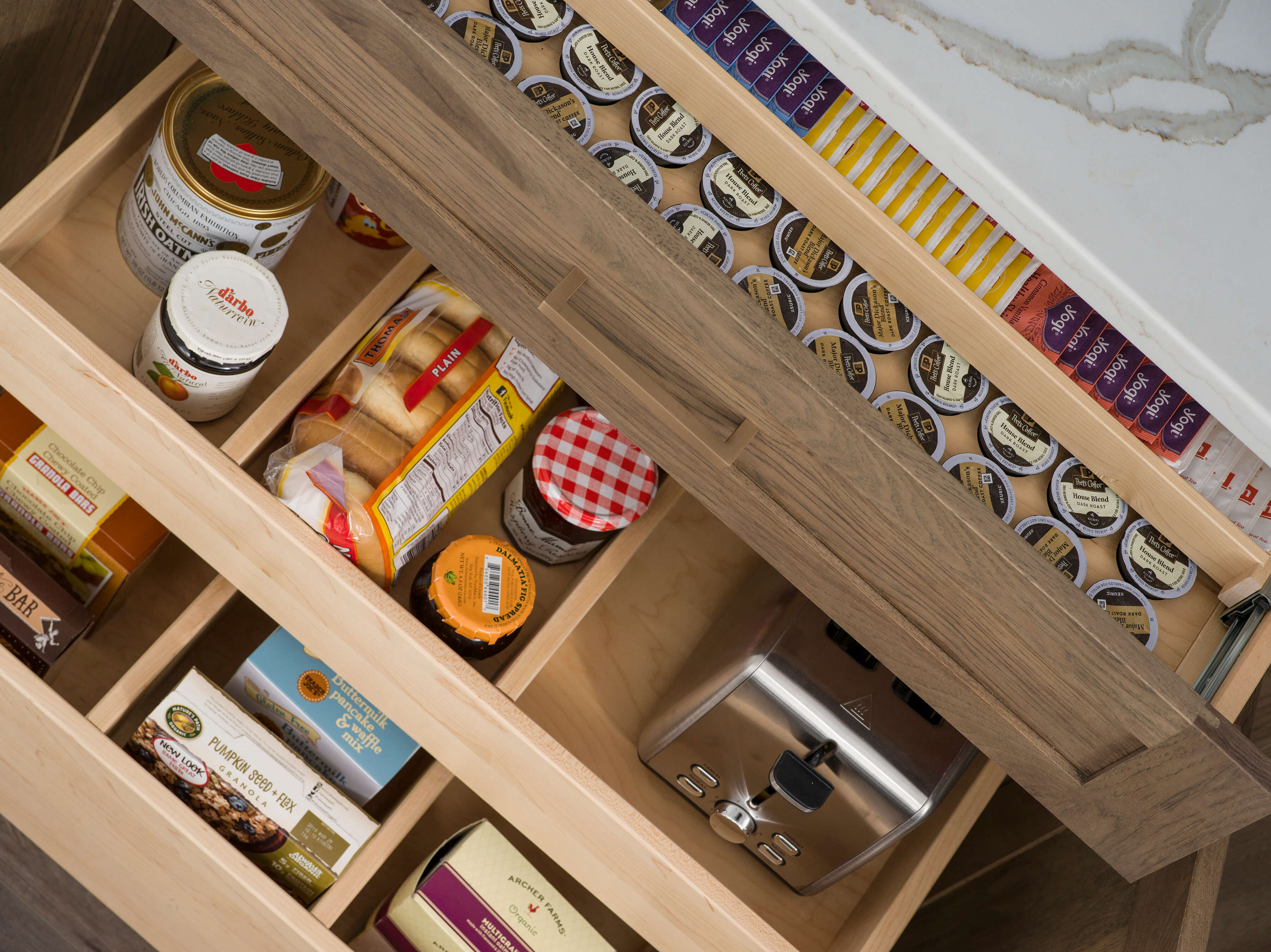 Below the drawer, a cabinet opens up with several roll-outs that have dividers for organized pantry storage and a dedicated place for a powered toaster.