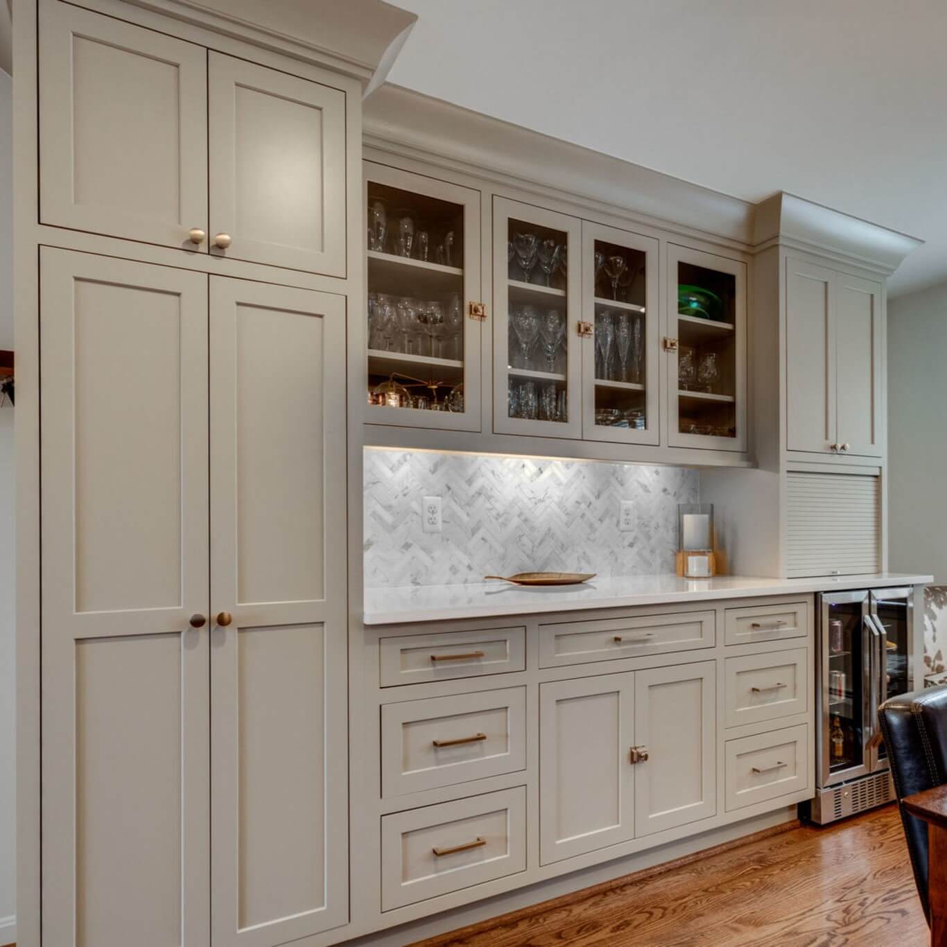 This final project was created by our friends at Bath Plus Kitchen of Alexandria, Virginia. This is another great example of creating a multi-use dry bar area located just off the kitchen. The inset Hudson door in Putty paint brings a classical look to the home, with glass doors on the uppers to display glassware and a pantry for the storage of dry goods. Roll-out shelves in the base cabinets make it easy to search for the right mixer, while the tambour door hides small kitchen appliances for preparing morning breakfast.