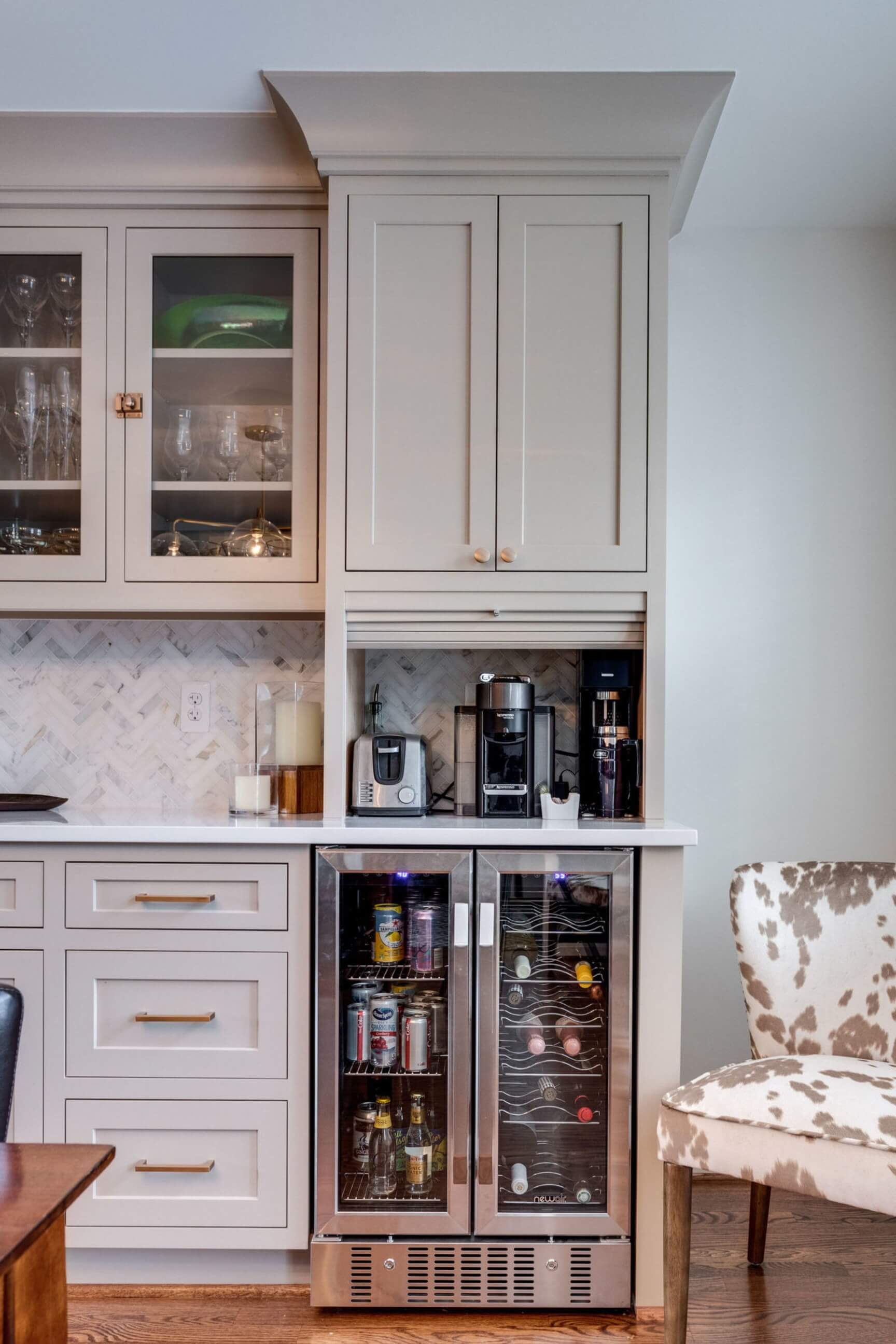 This beautiful beverage station features Dura Supreme’s Hudson Inset door style in the Putty paint finish.