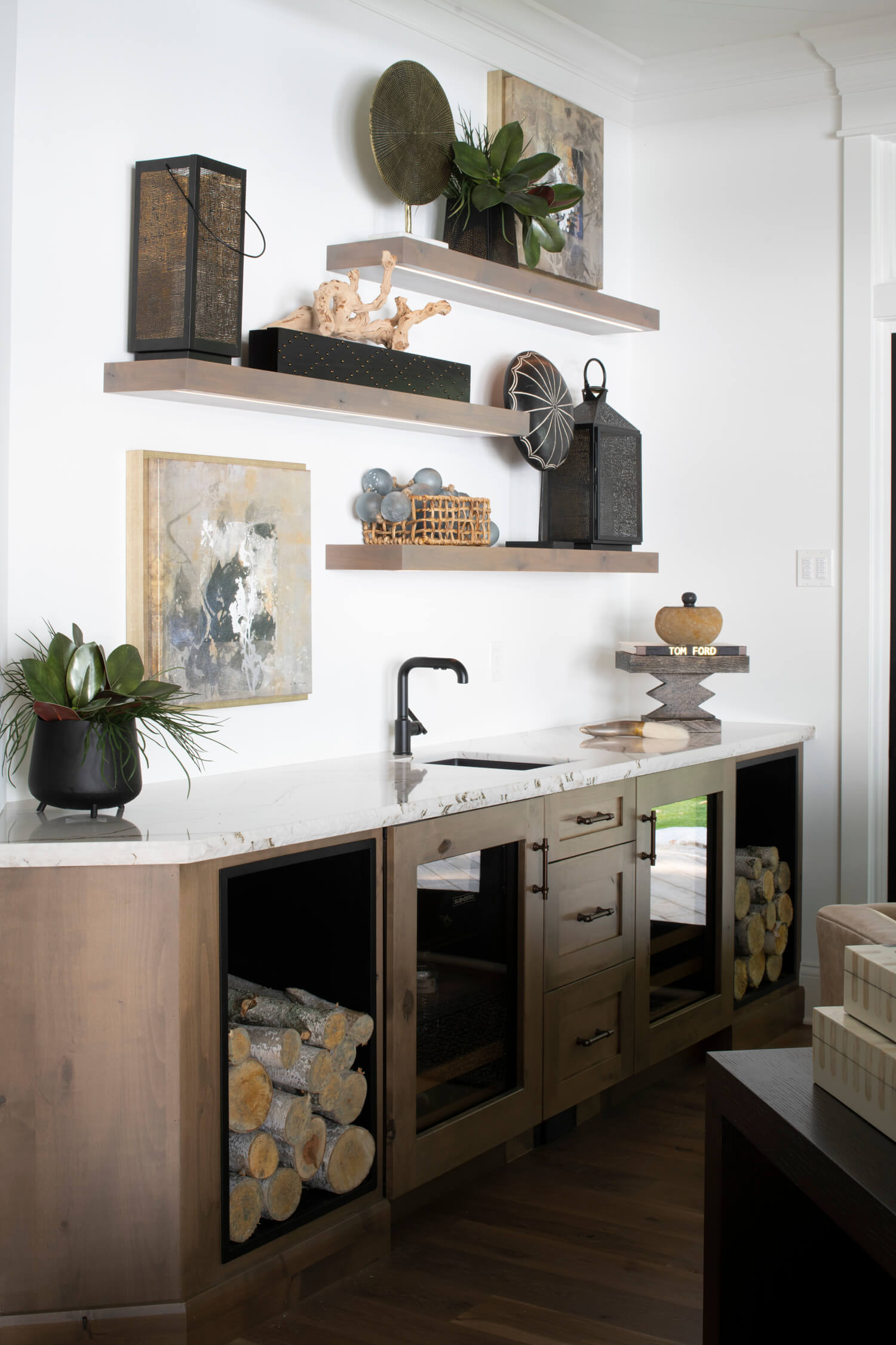 This is Minnesota living! The wet bar offers chilled beverages at the ready as well as fuel for a warm fire in the adjacent fireplace. No need to run outside for wood! The open cabinets are lined with inserts so that firewood logs can be added and taken out without damaging the interior of the cabinets. The rustic Knotty Alder cabinets in our classic Hudson shaker door style with Cashew/Coffee stain glaze adds to the warmth of the space, perfect for gathering around on cold winter nights.