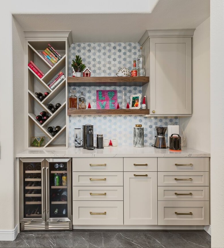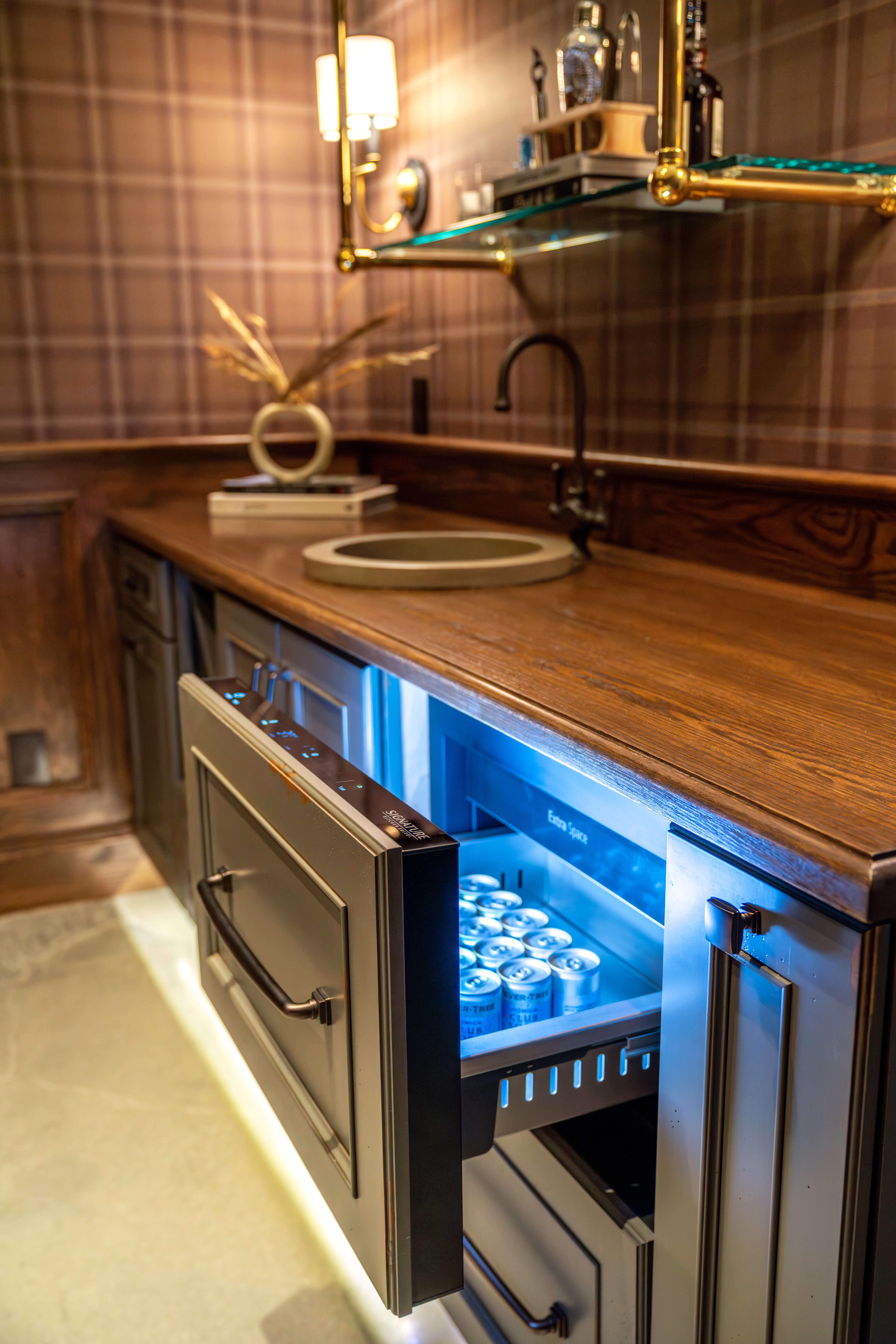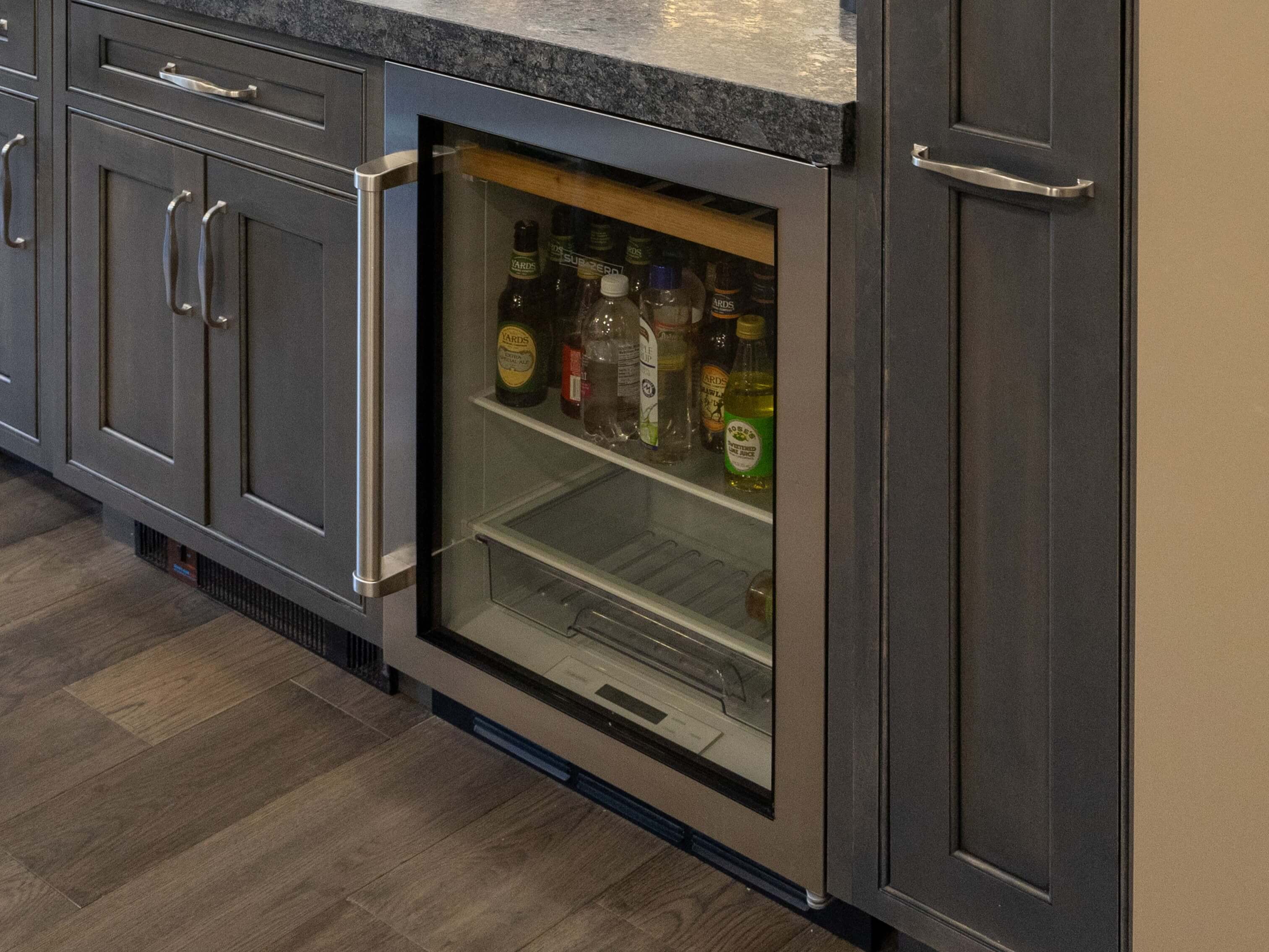 A beverage refrigerator is a must for most wet bar or beverage center designs.