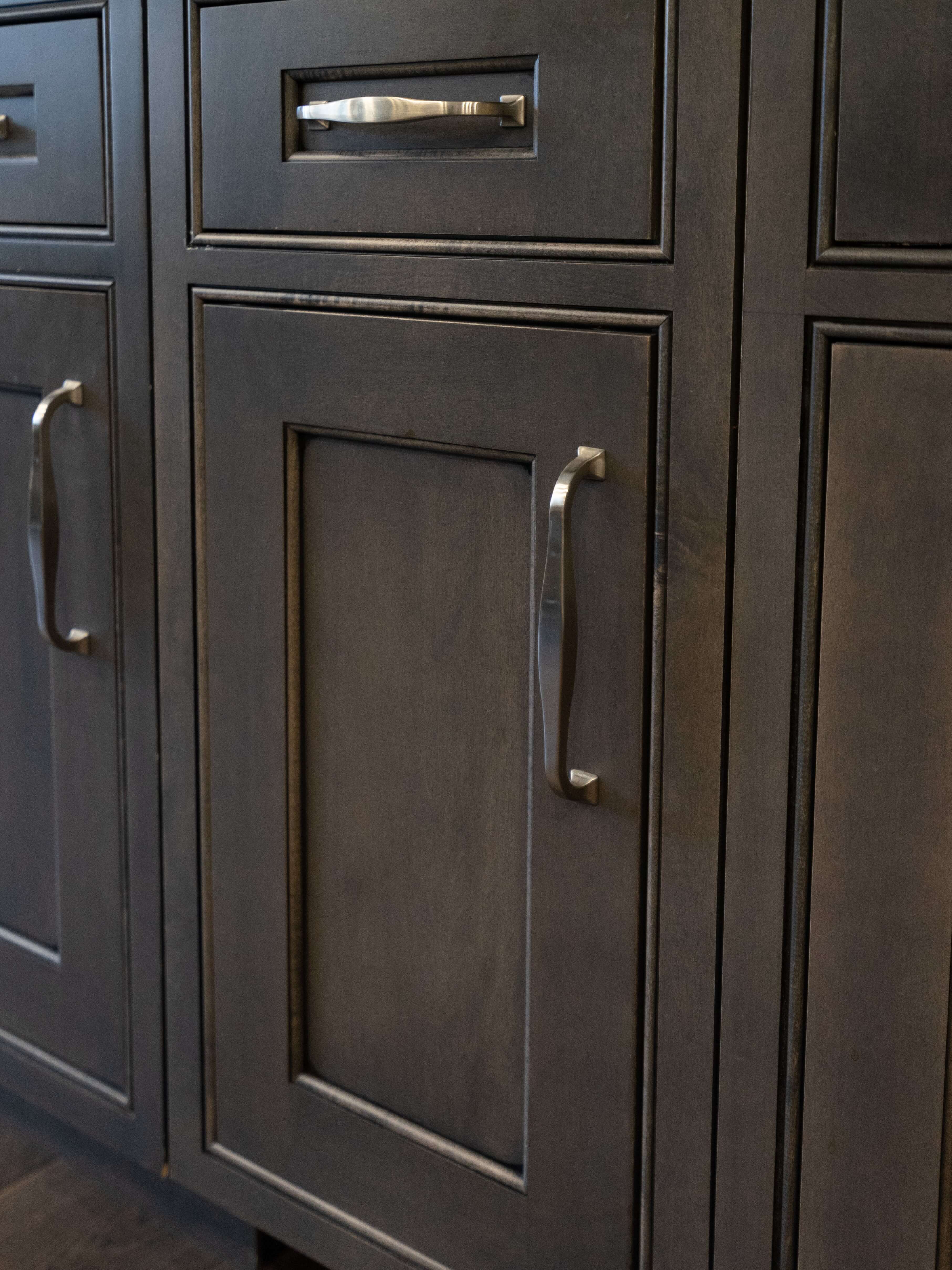 The home bar below is multi-functional and packs a lot into a single run. It acts as a coffee station for needed caffeine moments, as well as offering plenty of storage for bottled drinks, both refrigerated and room temperature. The Tall Pull-Out Pantry makes it easy to find the right mixers for making the perfect Manhattan or Old Fashioned. The built-in ice maker is integrated into the design with a matching appliance panel to hide it within the run of base cabinets. This design features our Monterey Inset door style with a beaded face frame in a Custom Finishe with a gray stain and shadow glaze on the Maple wood species.