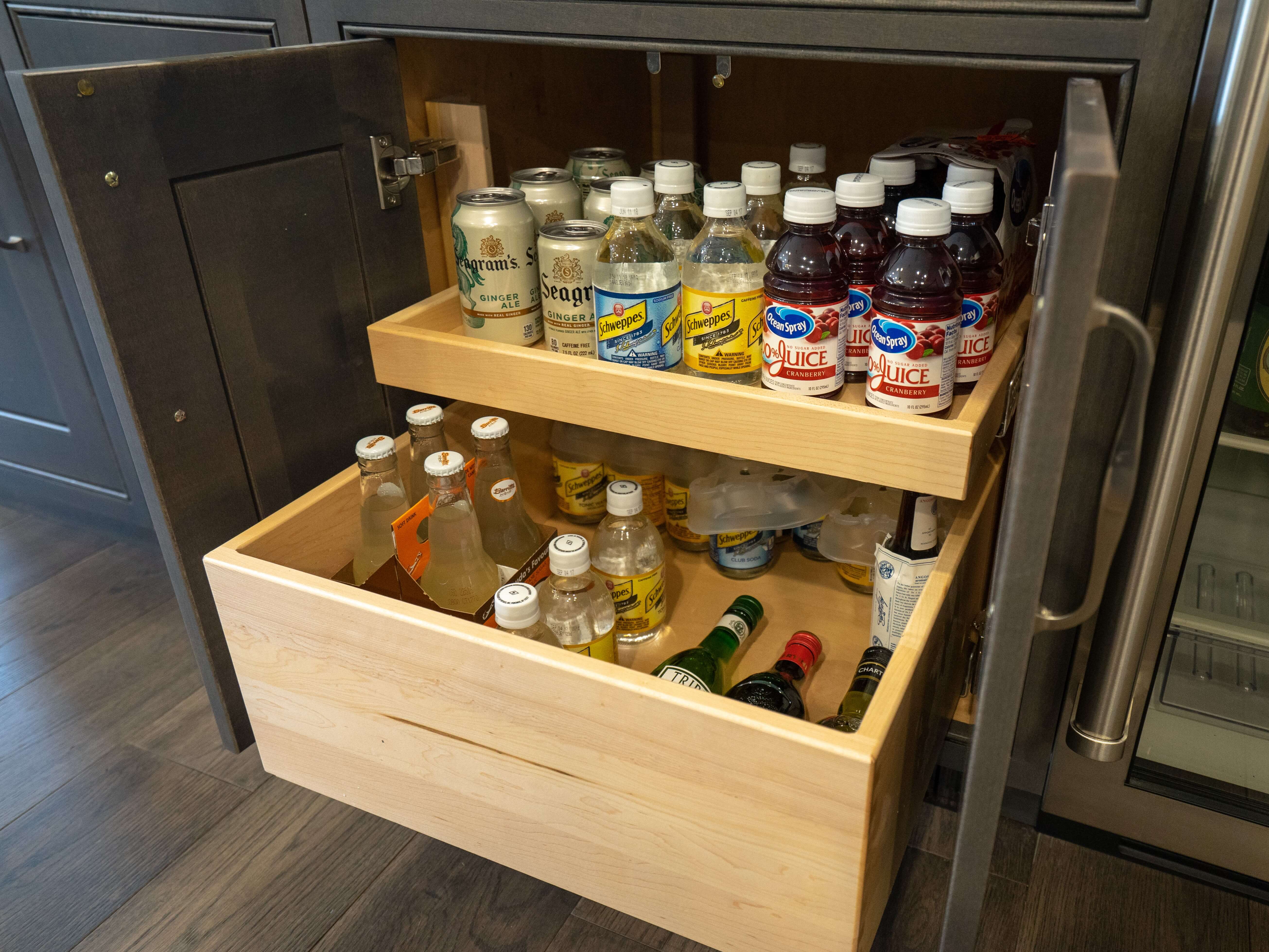 Dura Supreme’s Tall Pull-Out Pantry (with optional wire shelves) packs a lot in it, with easy access to bottles from both sides.