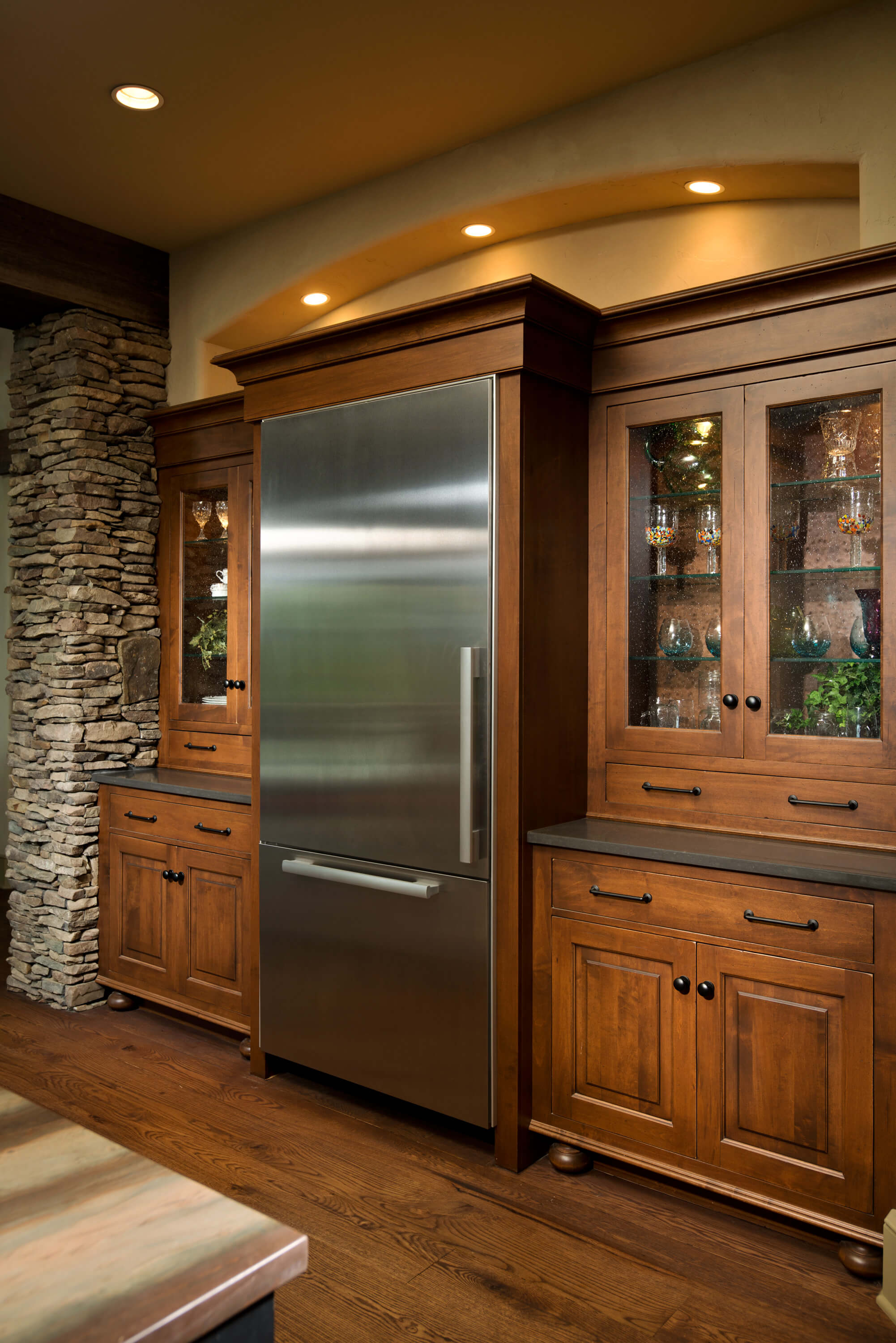 The built-in fridge/freezer is completely hidden in what appears to be a hutch, and the decorative toe in style D finishes the look.