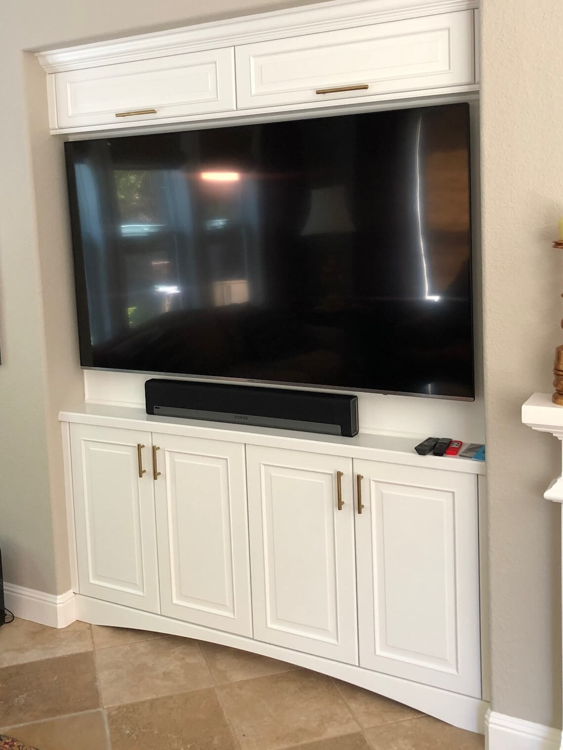 Loose Decorative Toe in style E completes the look for the TV alcove built-ins.
