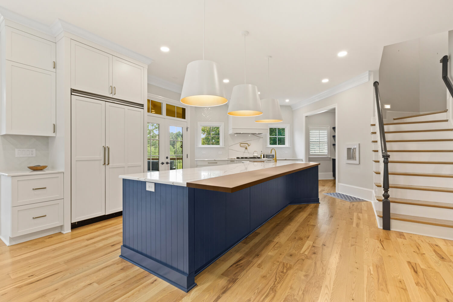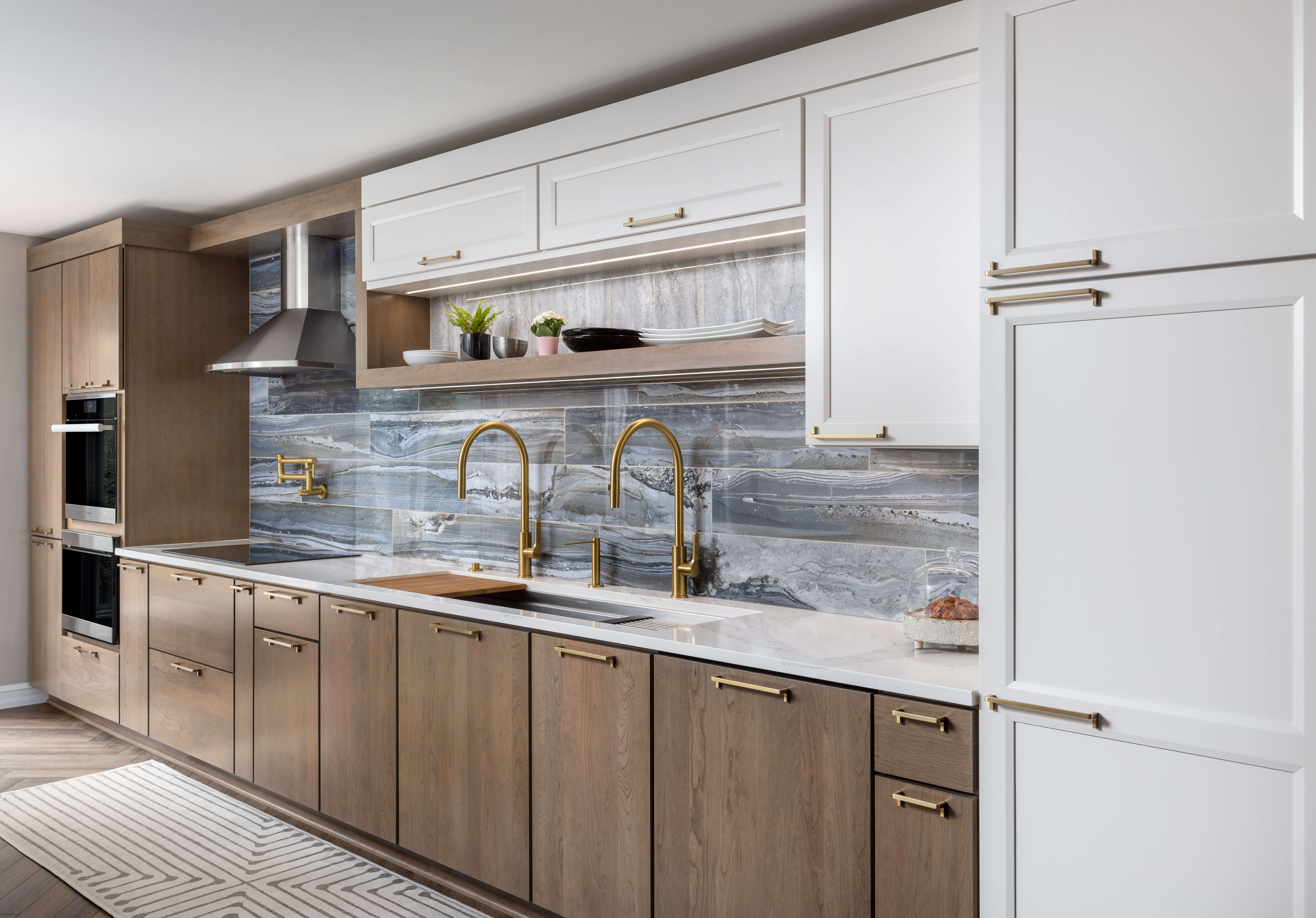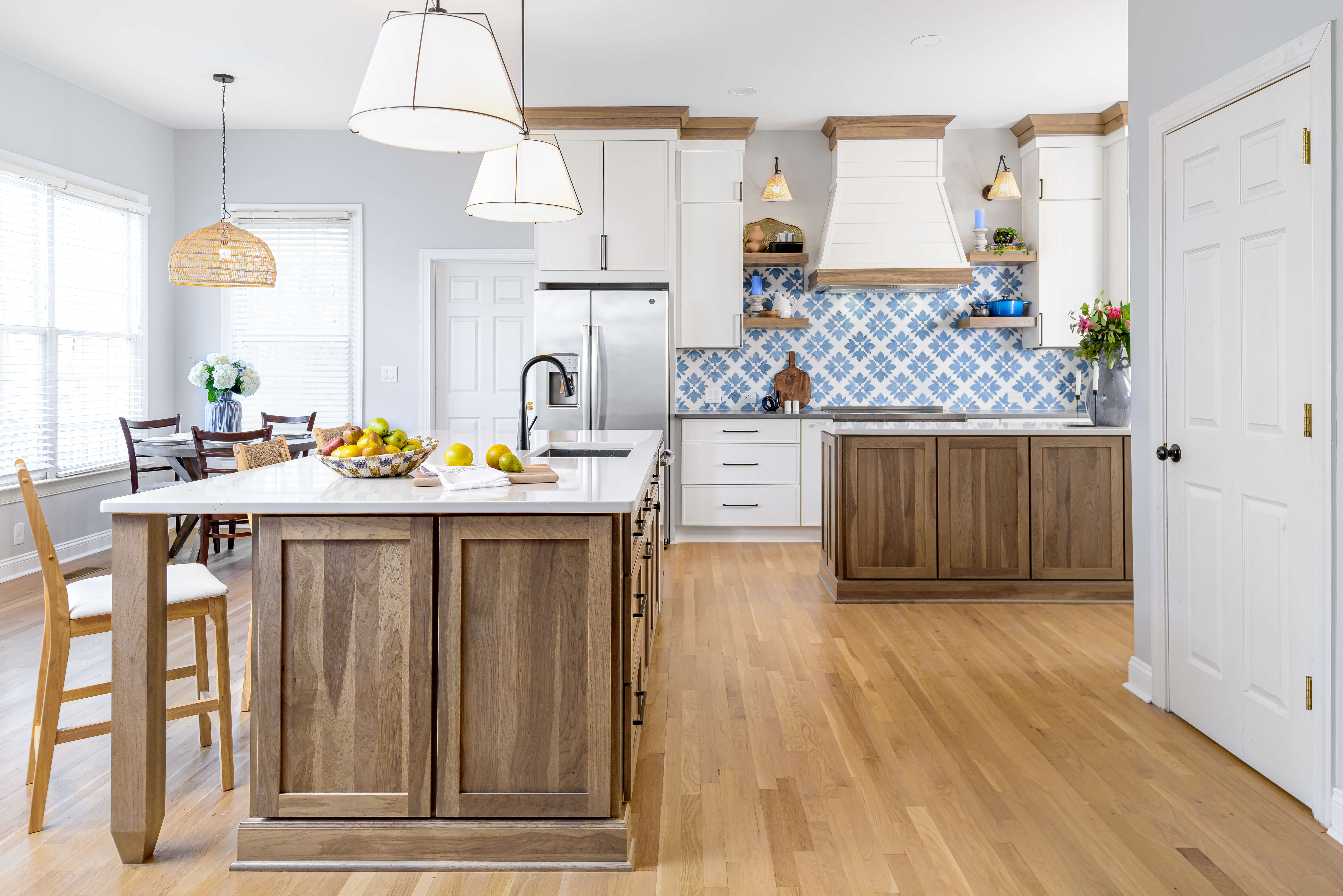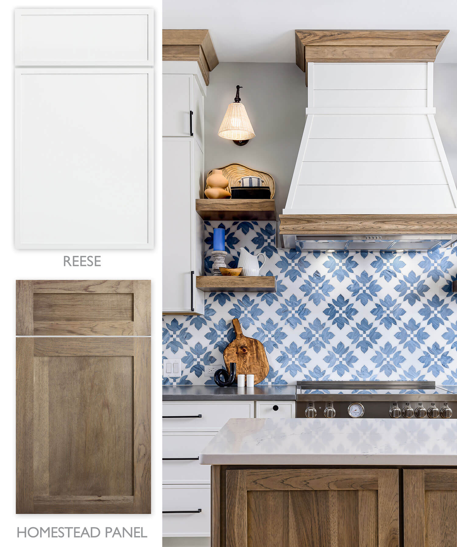 Transitional designs are the more popular style that many kitchen projects lean into, as they mix traditional styles with contemporary styles for added character and flair. It’s easier to pull off because of the mix. Below is a beautiful example of mixing door styles that one normally wouldn’t think of. The project consists of a skinny shaker door like our Reese in White paint combined with the Homestead Panel shaker door in Hickory with Cashew stain. Both door styles are in the Shaker family of doors however, the contemporary “skinny shaker” styling elevates the design to a whole different level that we love!