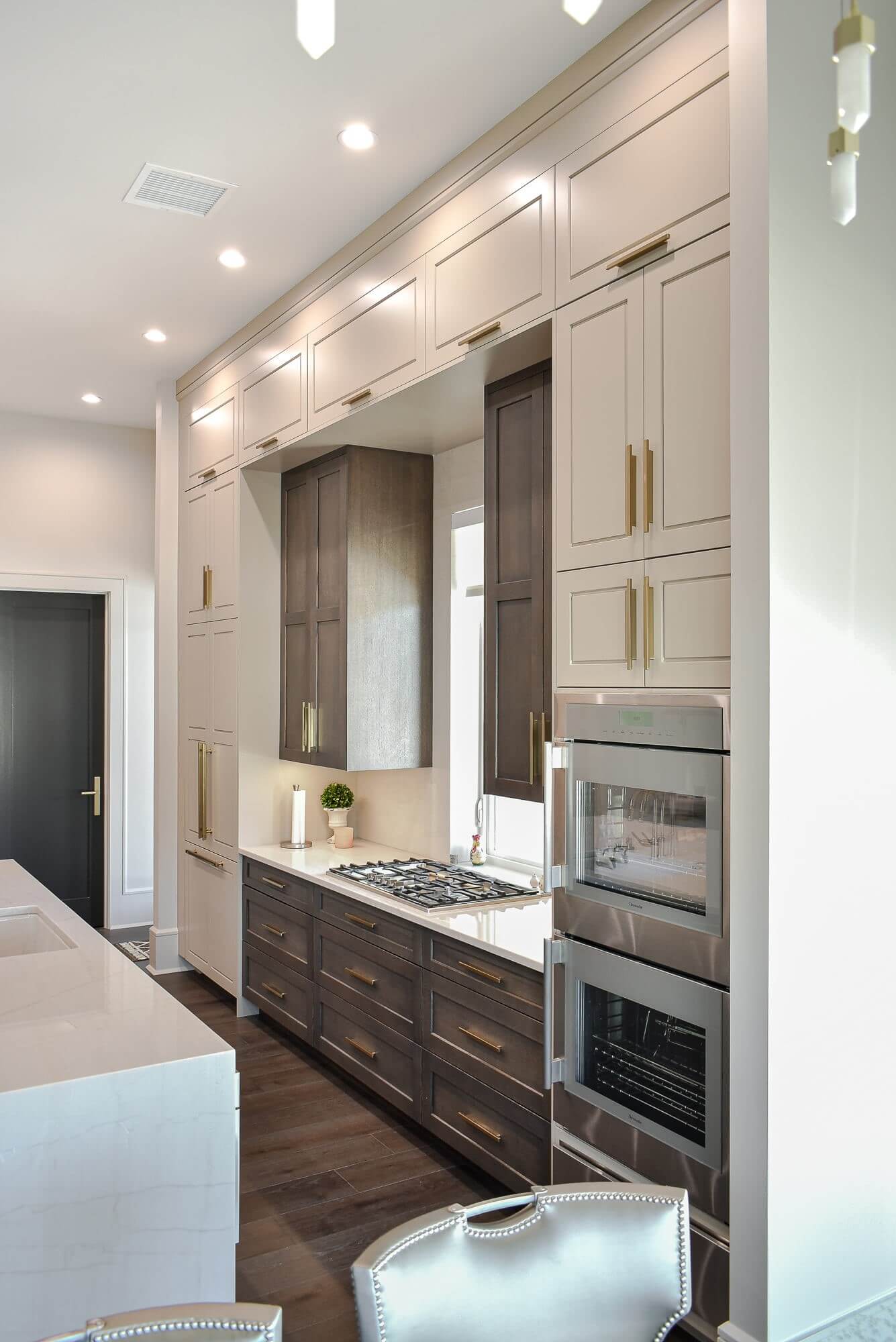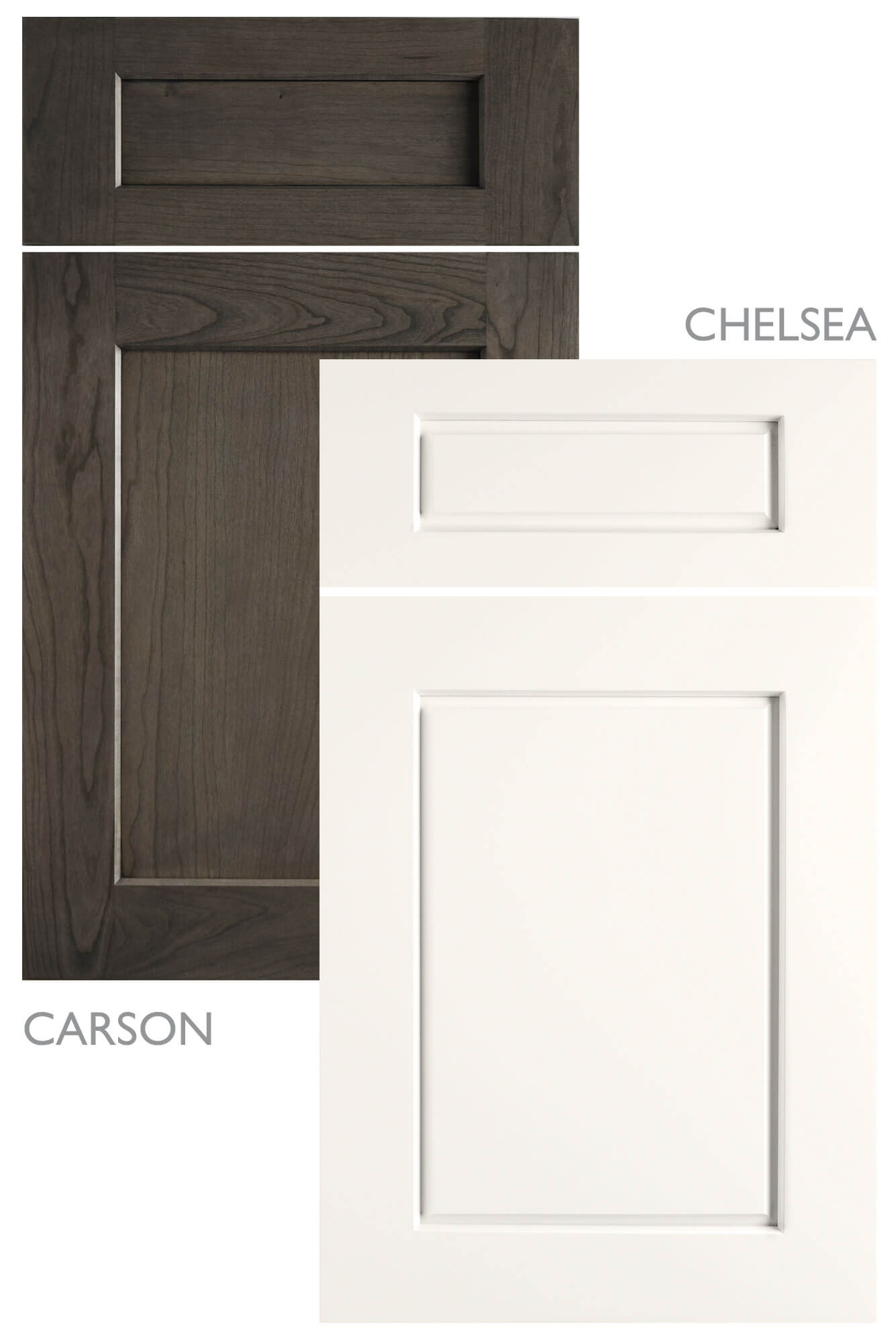 Below is a great example of mixing doors that come from the same family. This project features the Chelsea door in Putty paint with the Carson door in Quarter-Sawn White Oak with a custom stain finish. Both doors offer a cohesive look due to the same profiles and well as having the same size stiles and rails. The tight reveals of the center panel of the Chelsea door are what give it a striking look and lean towards a transitional style with our Bria frameless cabinets.