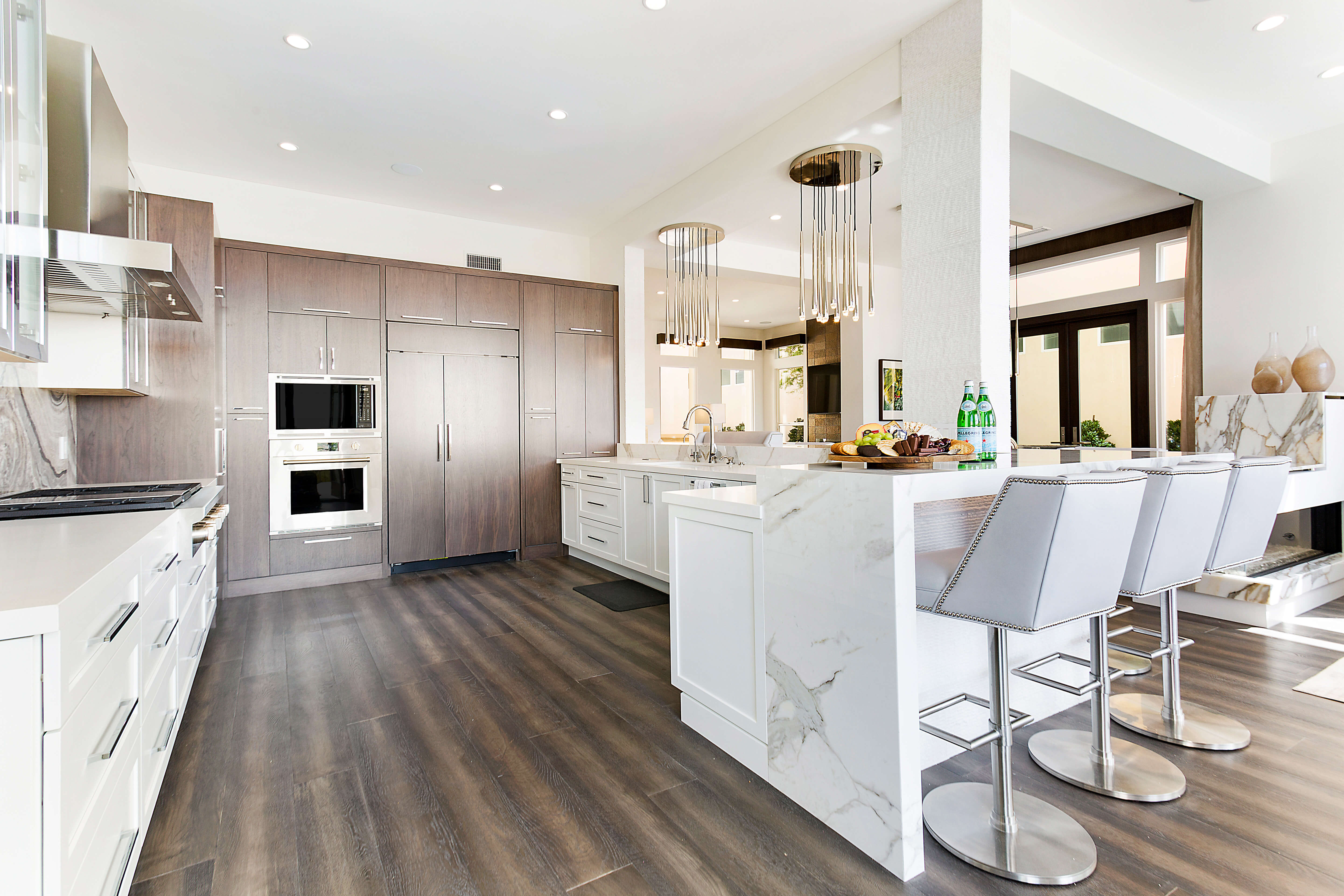 Mixing slab doors with 5-piece doors is so stinkin’ easy! It is a beautiful blend of traditional with contemporary, so if you’re torn between the two styles you can always combine both and get the best of both worlds! This project features our Hudson door in White paint for the base and wall cabinets, while the tall cabinets on the back wall were specified with our Metro veneer door in Walnut with Morel stain finish.